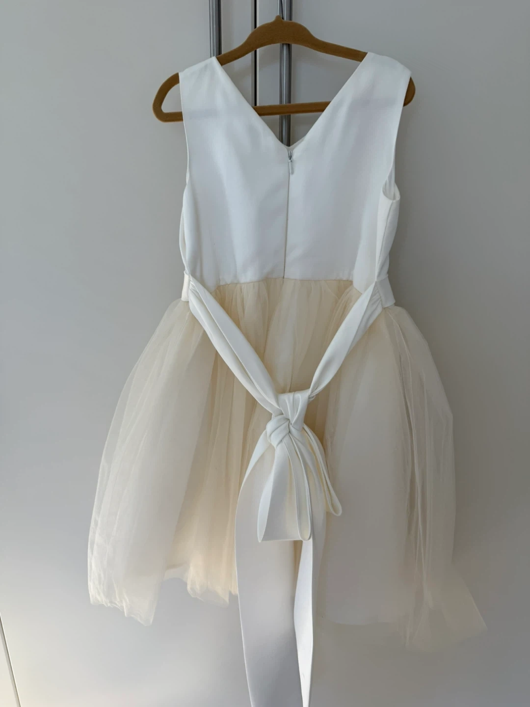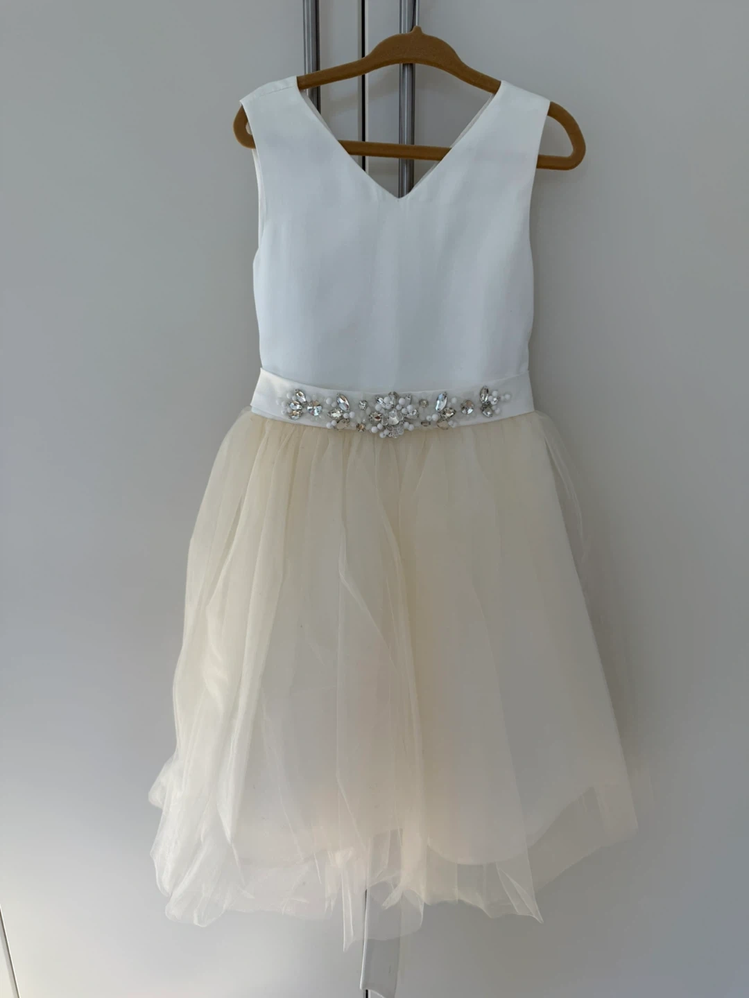 This adorable white tutu dress is perfect for a special occasion! It features a sleeveless design with a v-neck and a tulle skirt. The dress has a beautiful cream-colored sash around the waist. It's in great condition and ready for a new owner