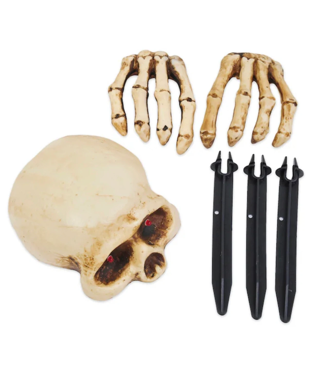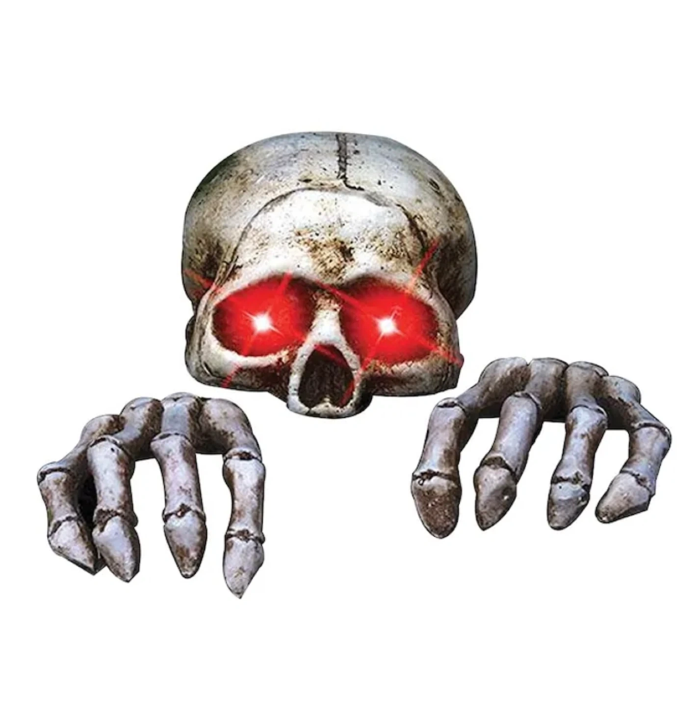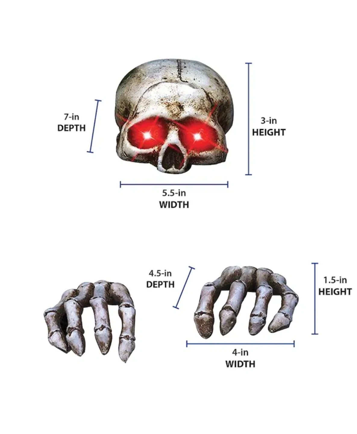 75Spooky Halloween decoration featuring a skull and hands. Includes stakes for easy placement in your yard or garden. Perfect for adding a creepy touch to your Halloween display