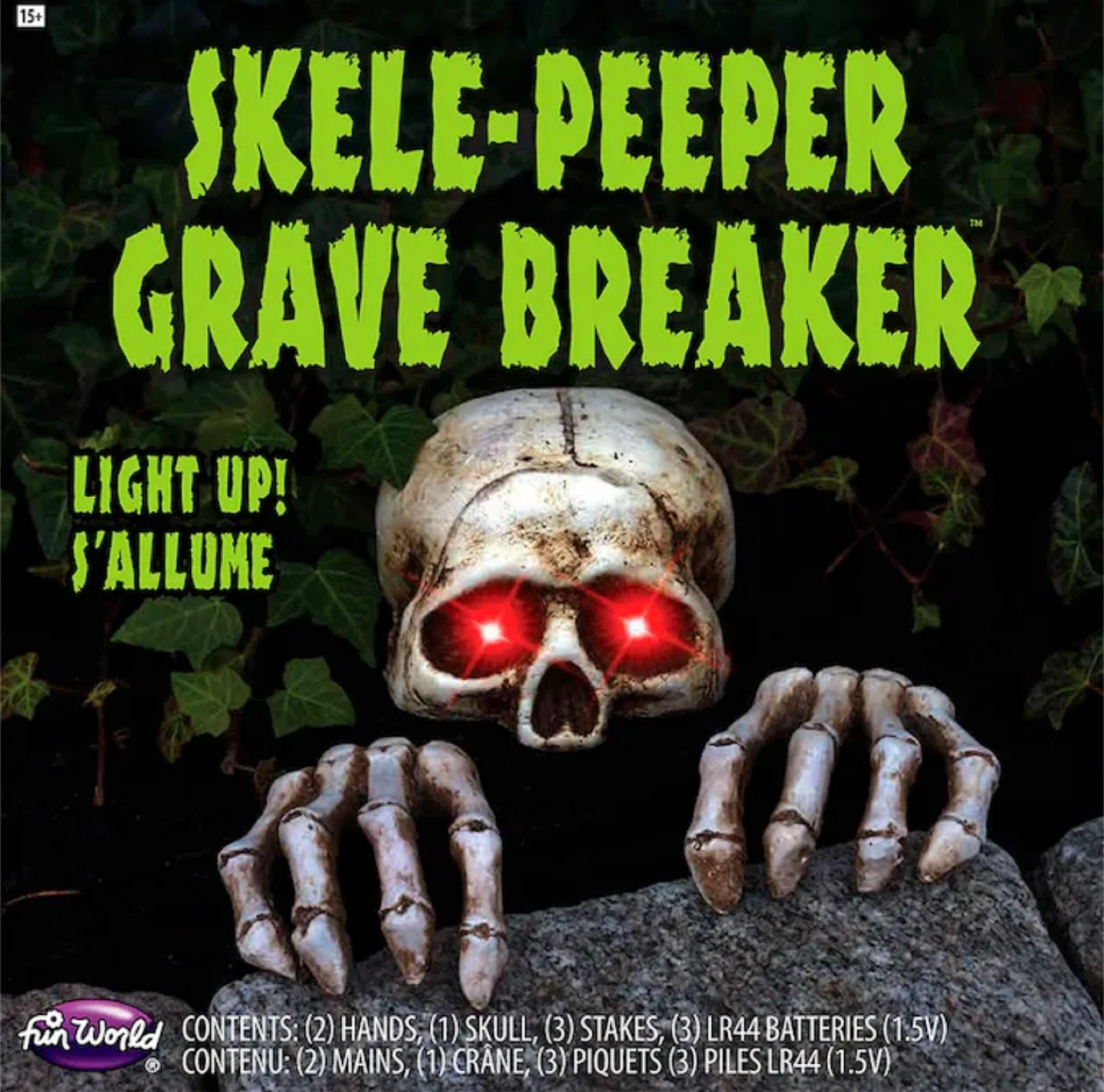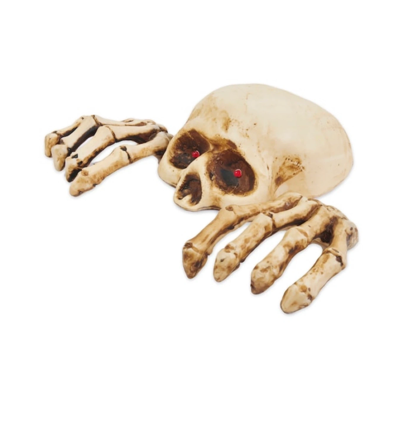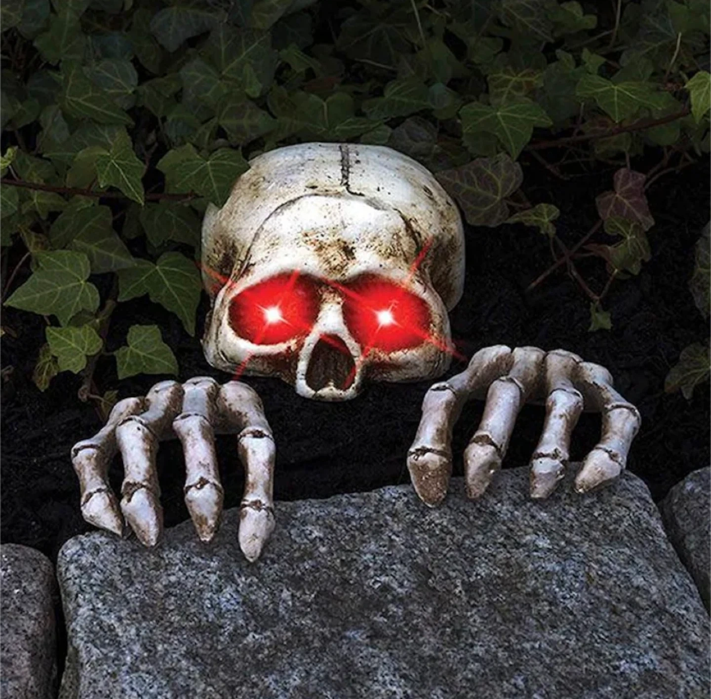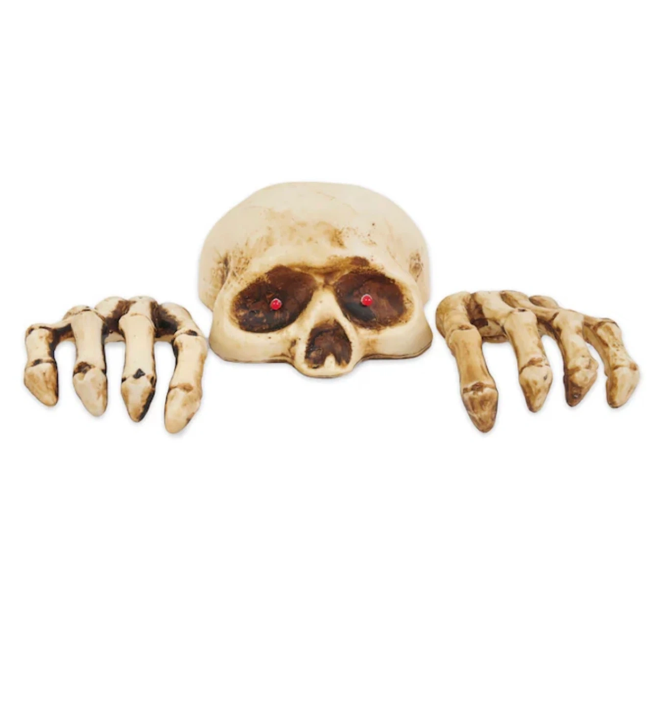75Spooky Halloween decoration featuring a skull and hands. Includes stakes for easy placement in your yard or garden. Perfect for adding a creepy touch to your Halloween display