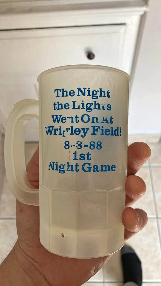 65Vintage Old Style Wrigley Field 1st Night Game commemorative cup, 8-8-88. Last picture isn’t great, but it’s just to show it does still faintly glow in the dark. Great to add to a collection. Hand wash is recommended. Pickup only in Jefferson / portage park area