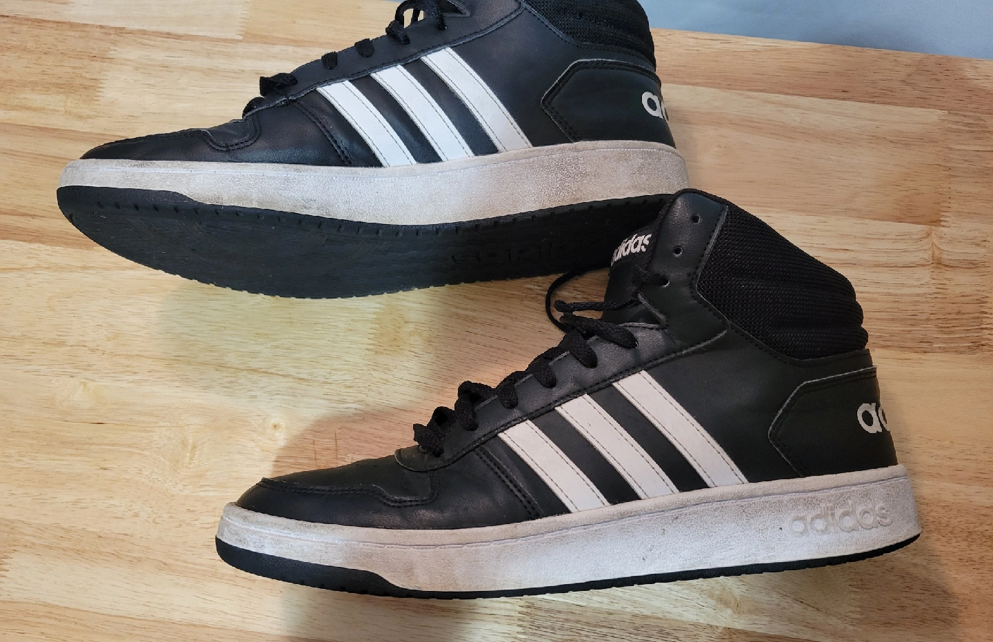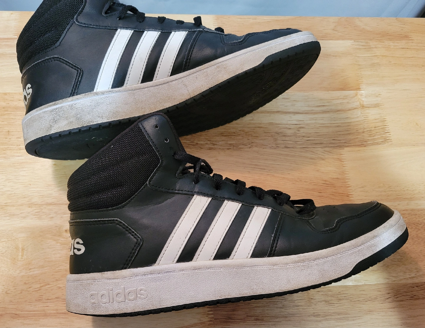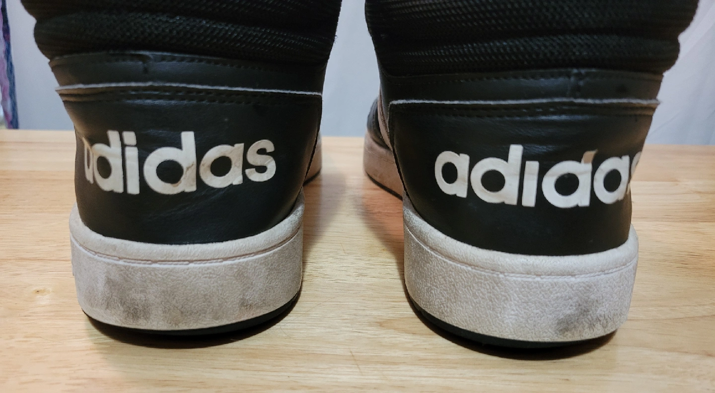 92Selling a pair of Adidas Hoops Mid 3.0 sneakers in black with white stripes. They're in used condition, as you can see in the pictures. Stains on a sole. Great for everyday wear!