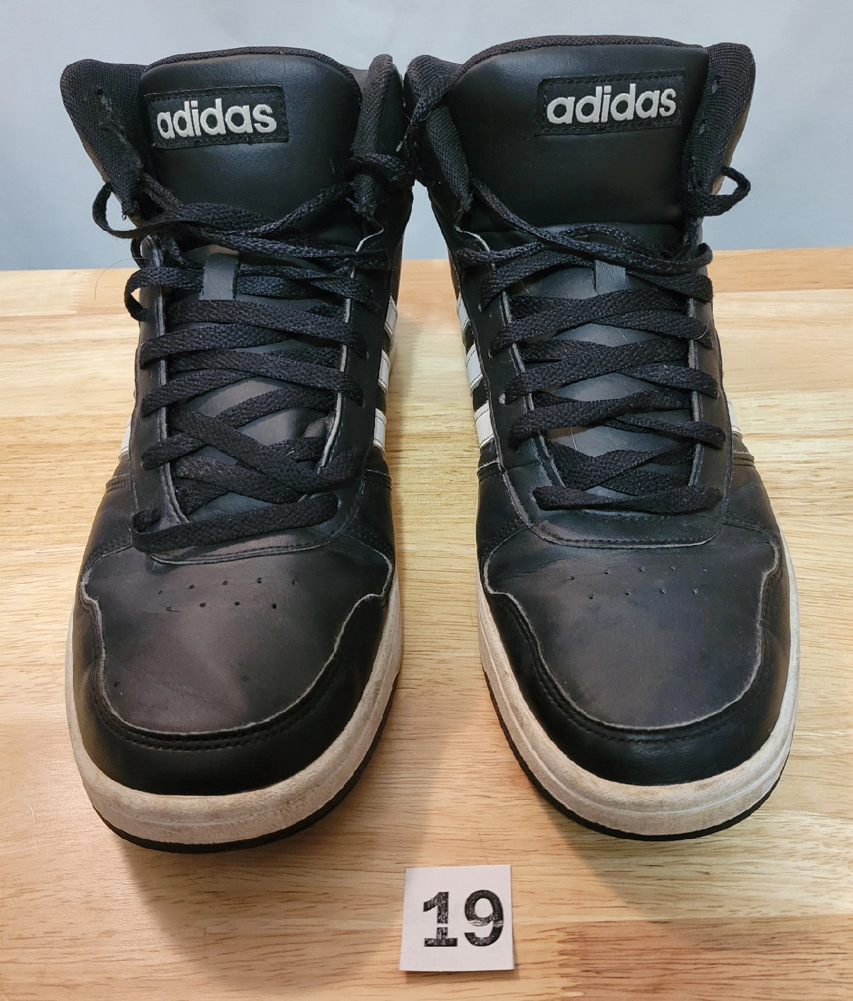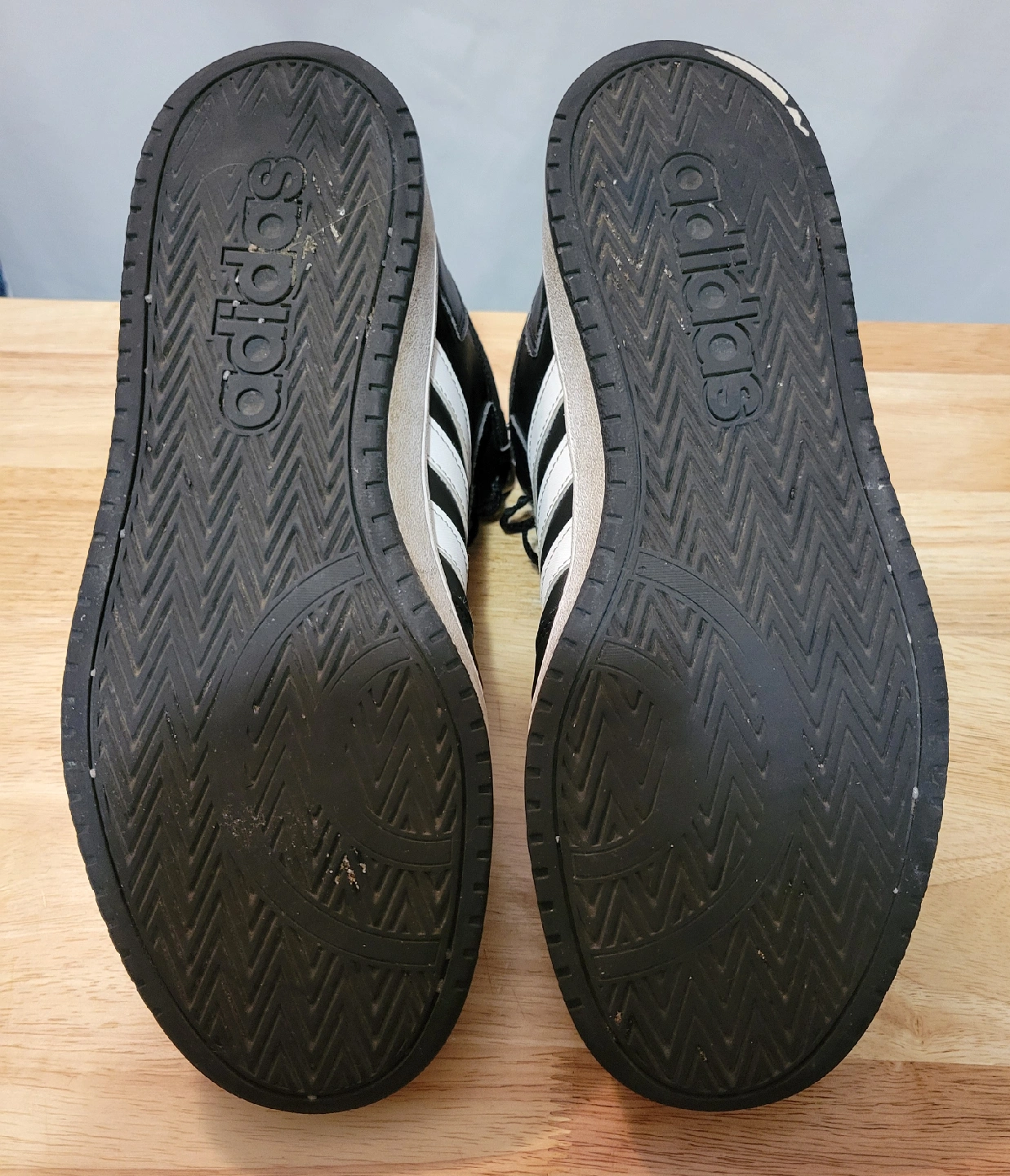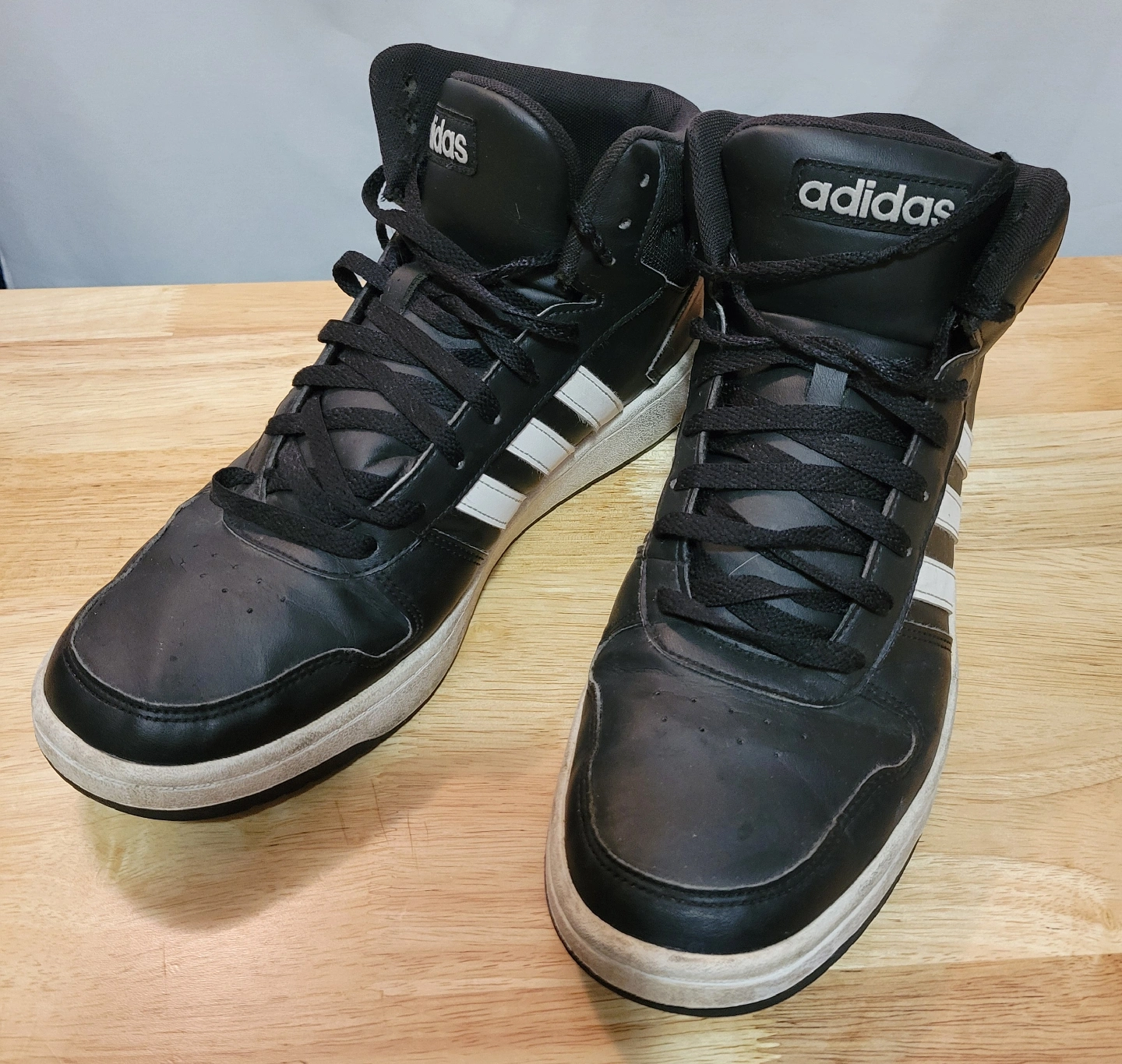 92Selling a pair of Adidas Hoops Mid 3.0 sneakers in black with white stripes. They're in used condition, as you can see in the pictures. Stains on a sole. Great for everyday wear!