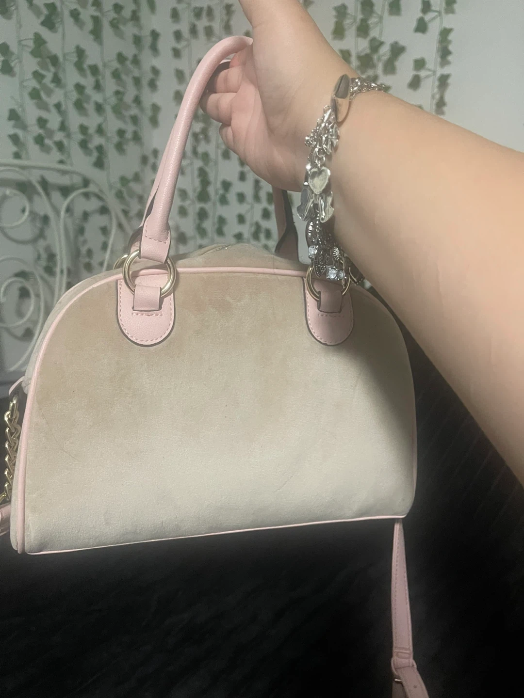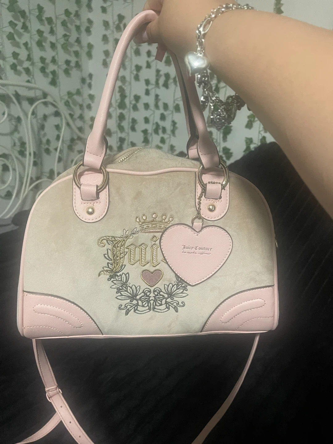 15Selling a cute Juicy Couture shoulder bag! It's a beige color with pink accents. Perfect for adding a touch of Y2K flair to your outfit. The bag features the Juicy Couture logo and a heart-shaped charm. It has both handles and a shoulder strap for easy carrying