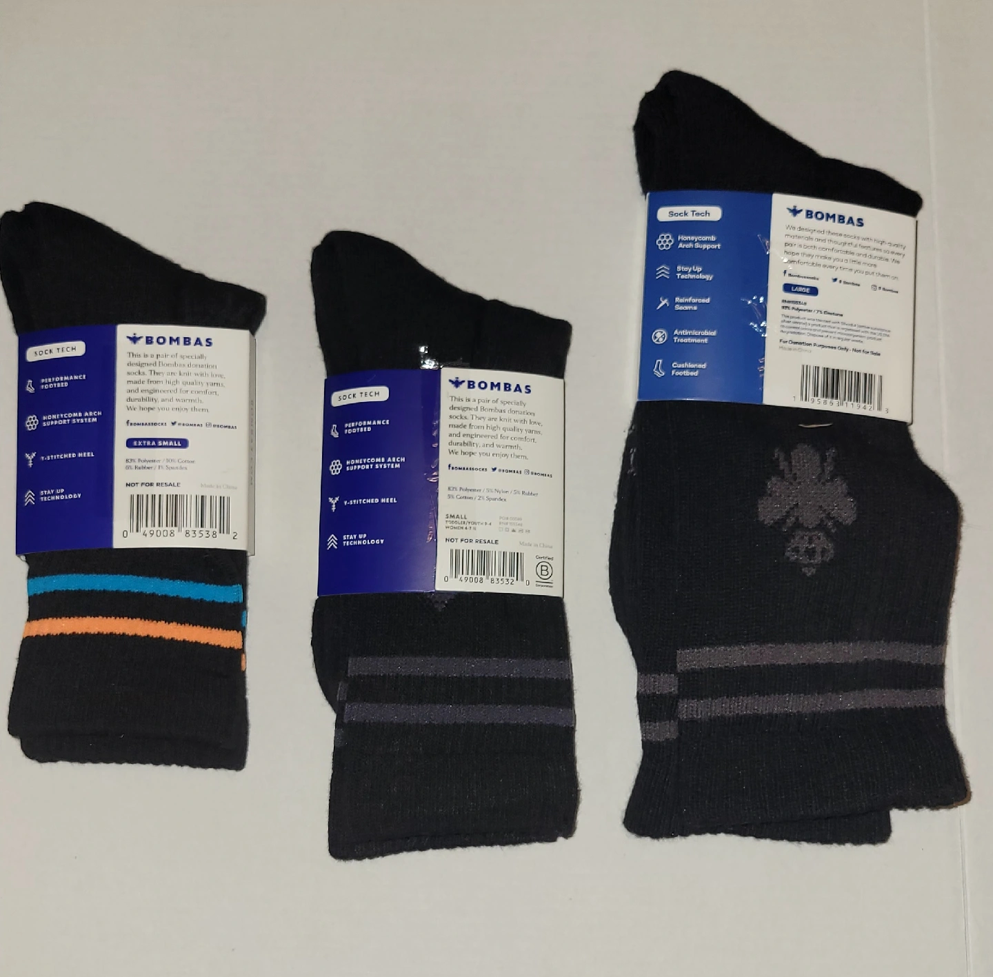 511Here are three pairs of Bombas socks. One pair is size XS, one is size S, and one is size L. They are knit with long staple yarns and engineered for comfort. One pair purchased = one pair donated
