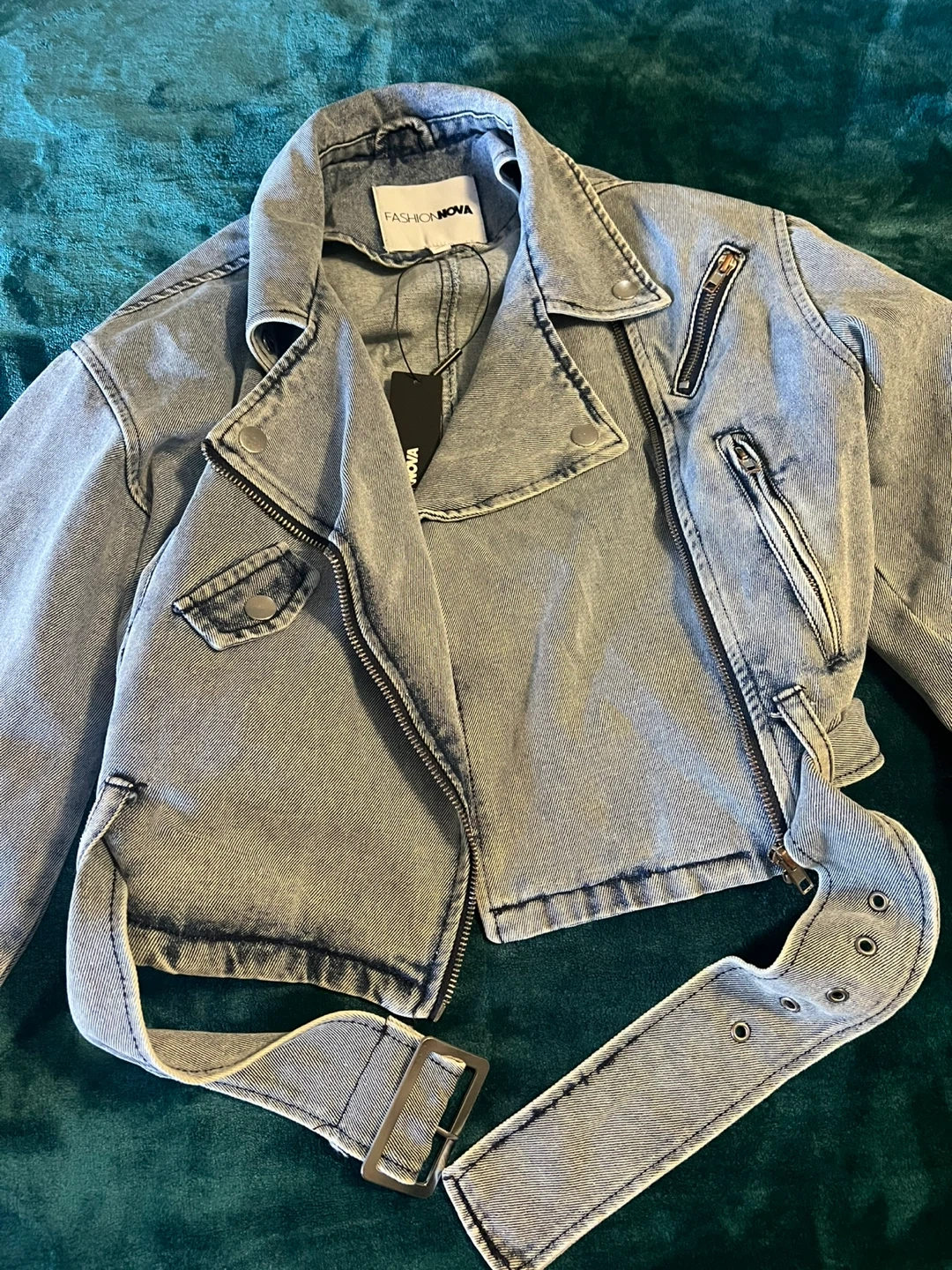 Selling a Fashion Nova denim moto jacket in size small. It's a stylish piece with a unique design. Perfect for adding a bit of edge to your outfit!