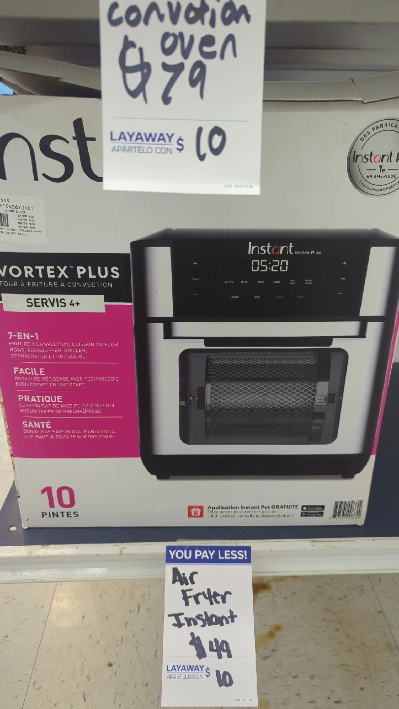 Selling an Instant Vortex Plus air fryer oven. It's a 7-in-1 appliance that can air fry, convection oven, roast, bake, broil, reheat, and dehydrate. It's easy to use and cooks food quickly and evenly. Serves 4+ and has a 10-pint capacity We offer layaway Ask for Alonso Message me for location