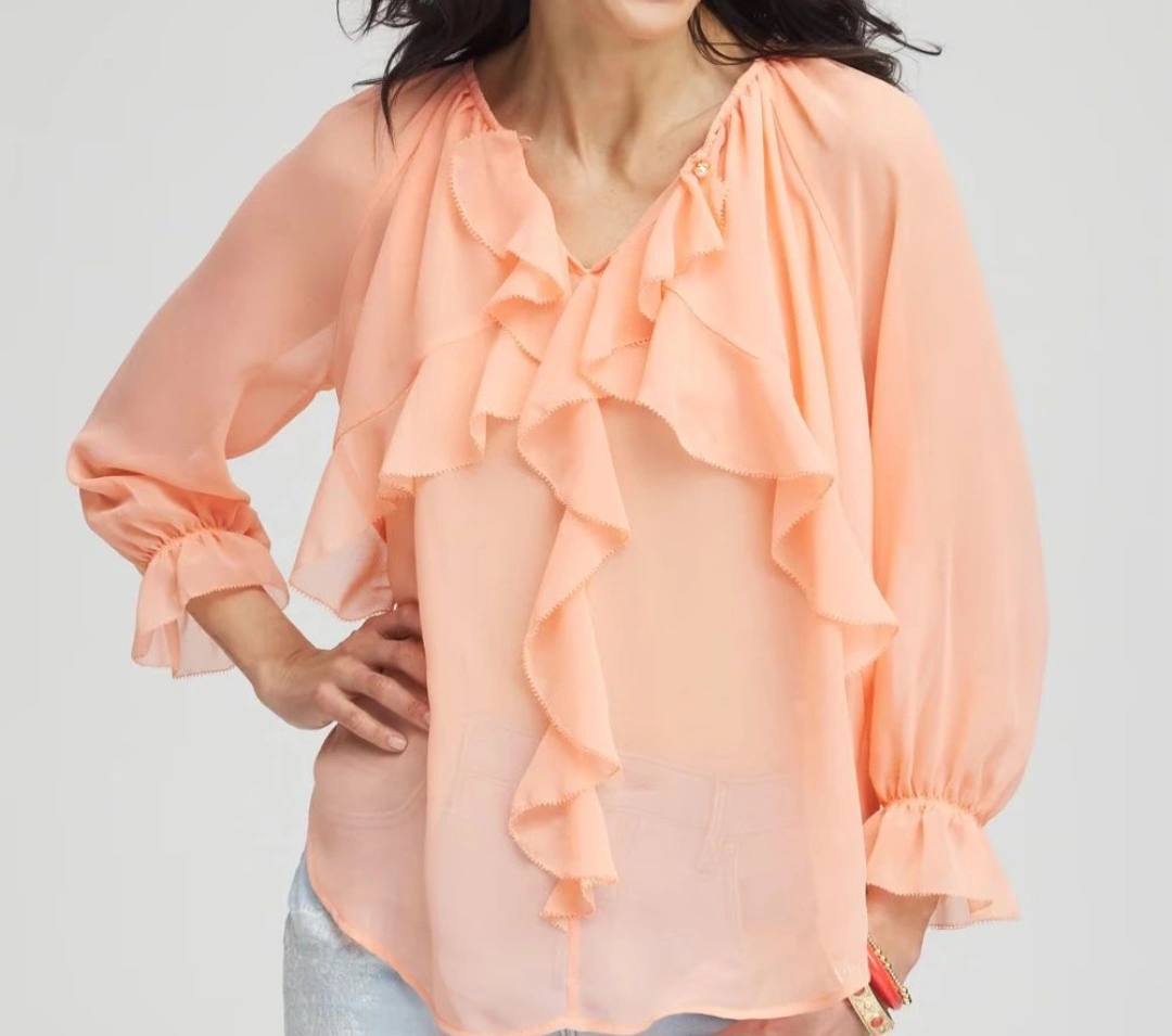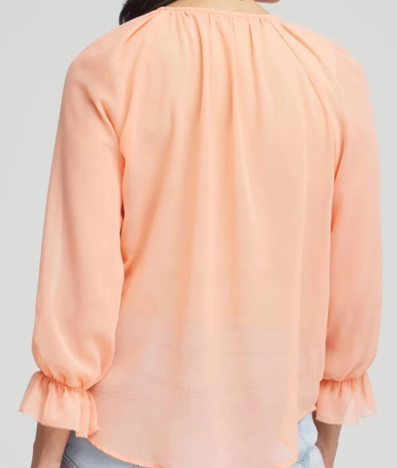 Beautiful peach-colored blouse with ruffle detailing! It's perfect for adding a touch of elegance to any outfit. The flowy design and soft material make it comfortable to wear, and the color is just lovely. It's in great condition and ready for a new home! Perfect for vacation.Size M