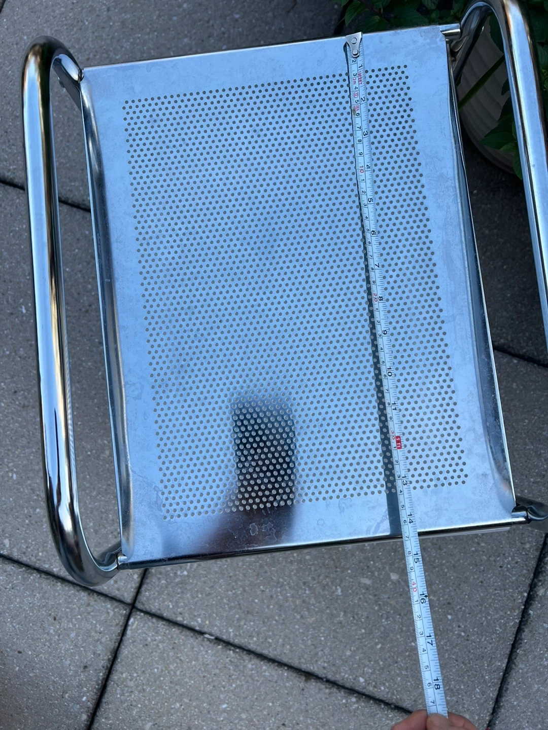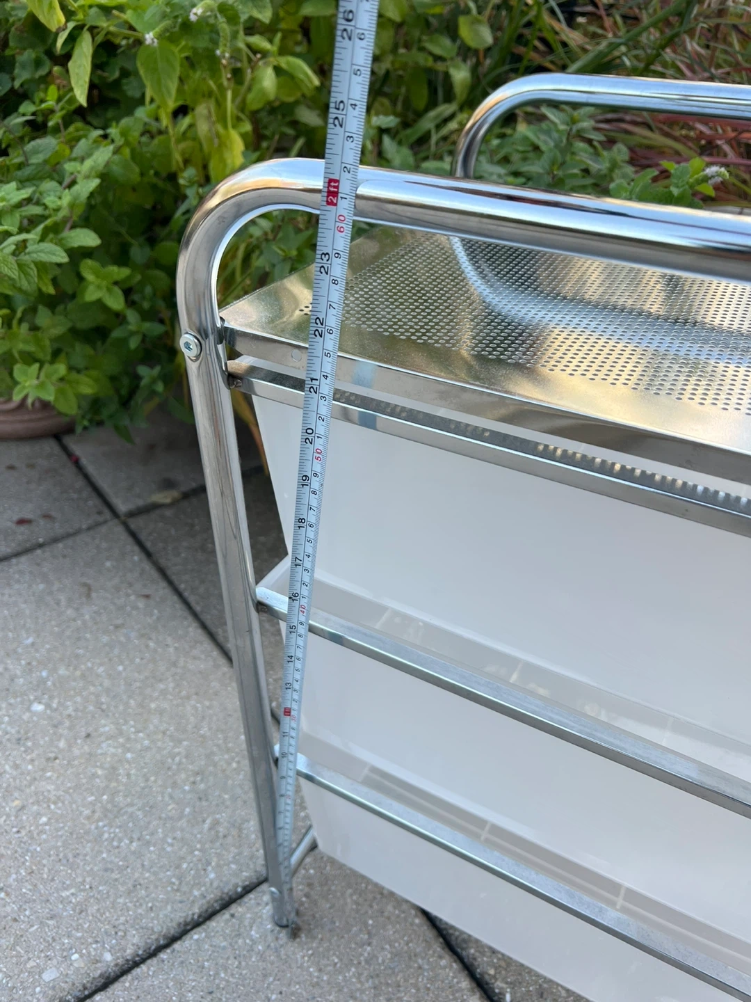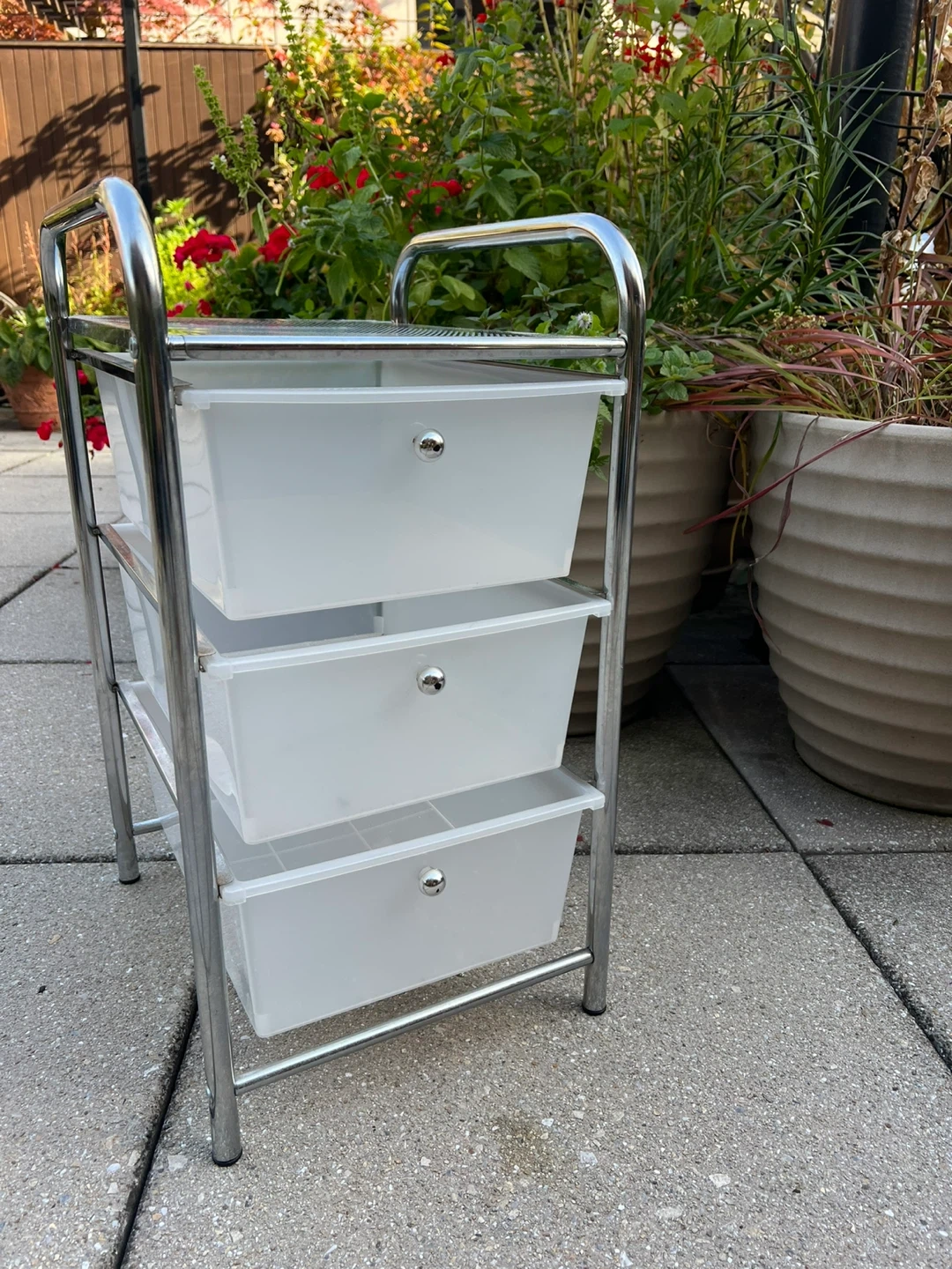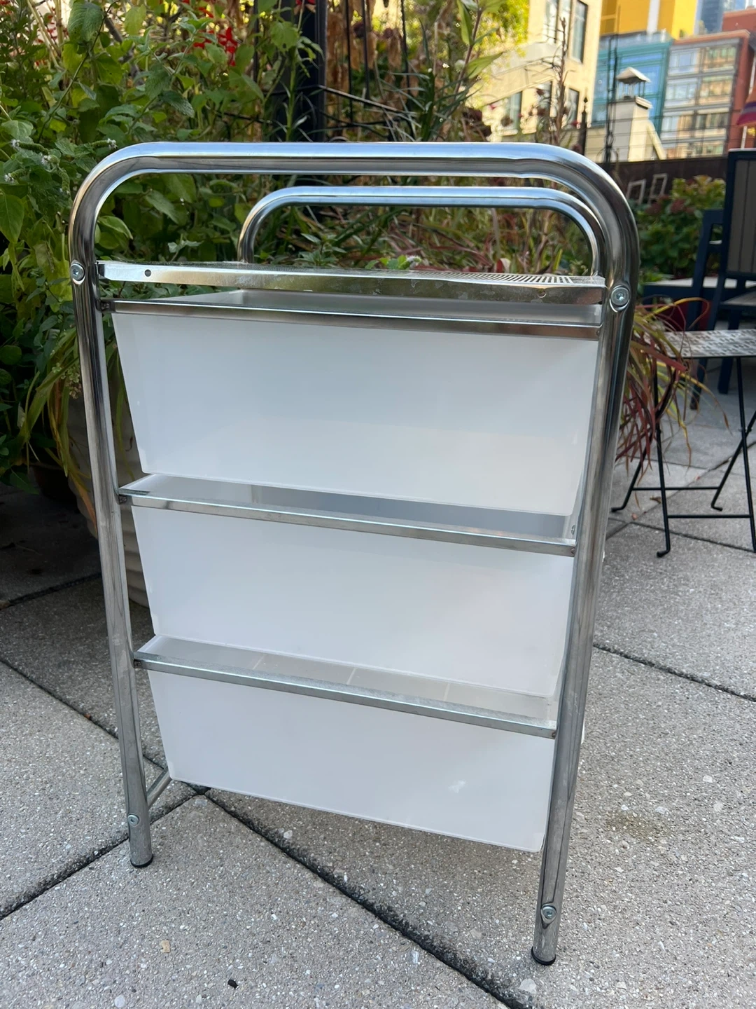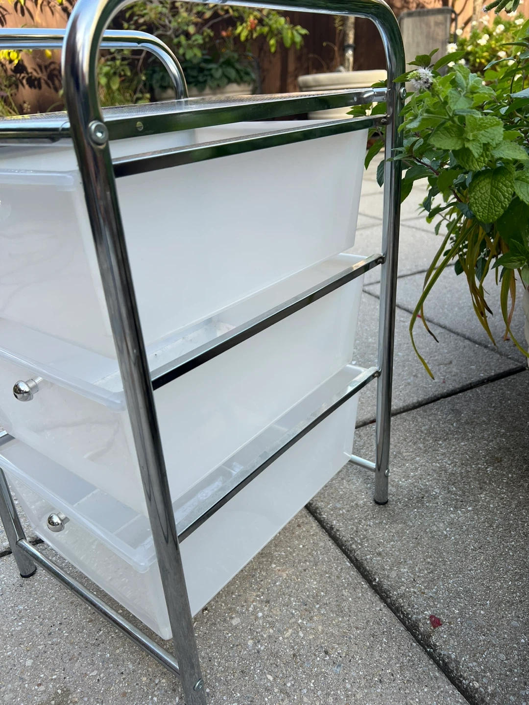 I'm selling a whatnot cart with three drawers. It's perfect for adding extra storage to any room! It features a chrome frame and white drawers. The top measures about 13 inches by 15 inches, and the overall height is around 24 inches