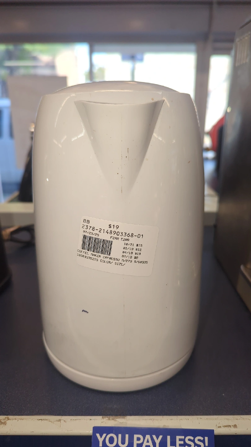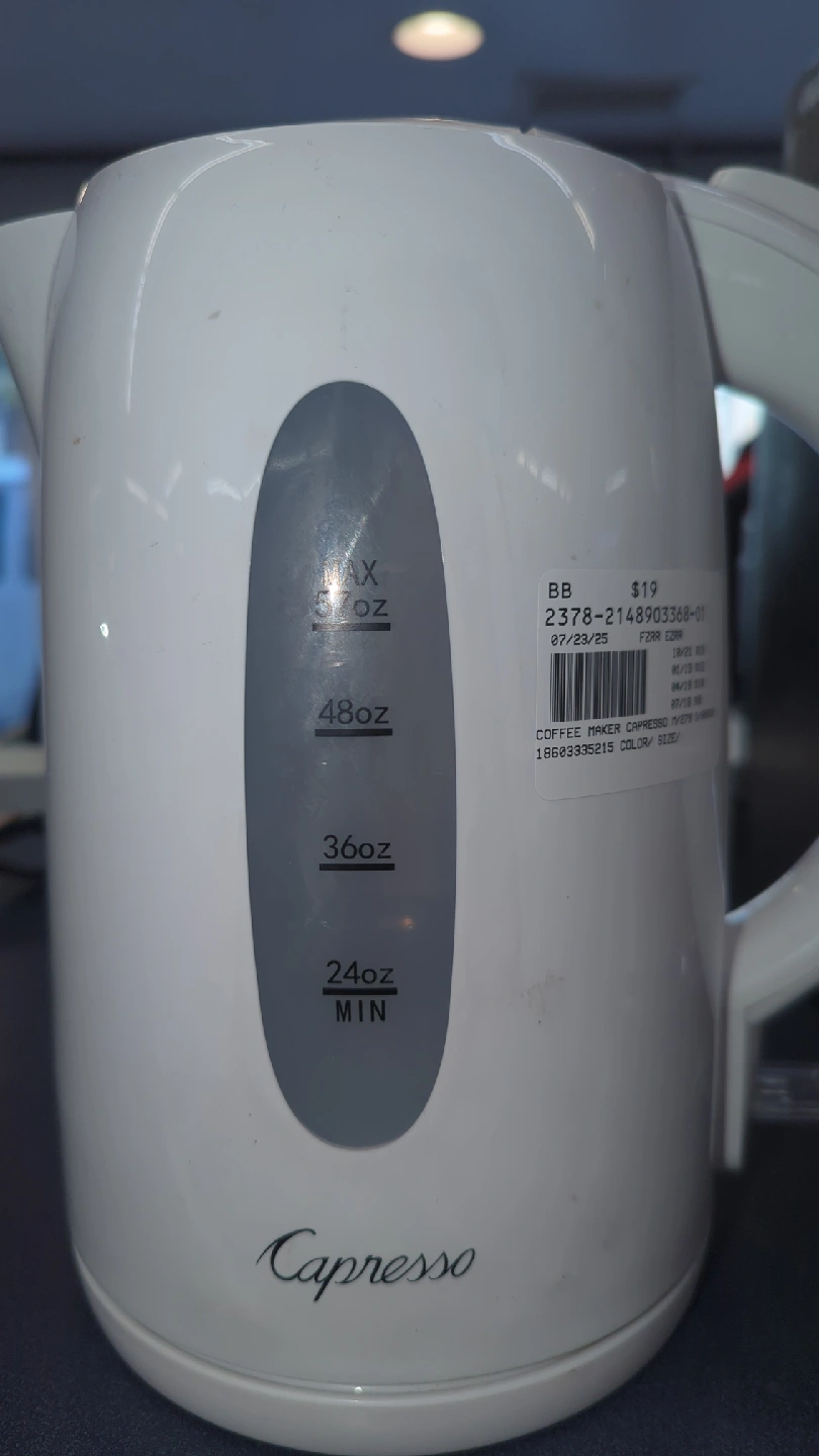 15Selling a Capresso electric kettle in white. It has a capacity from 24oz to 57oz. Perfect for making coffee or tea!