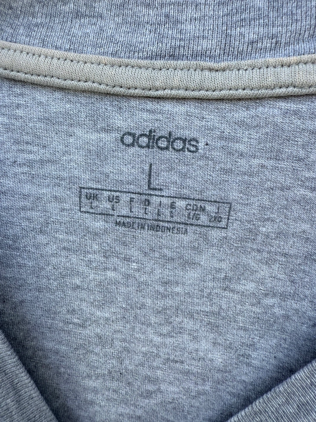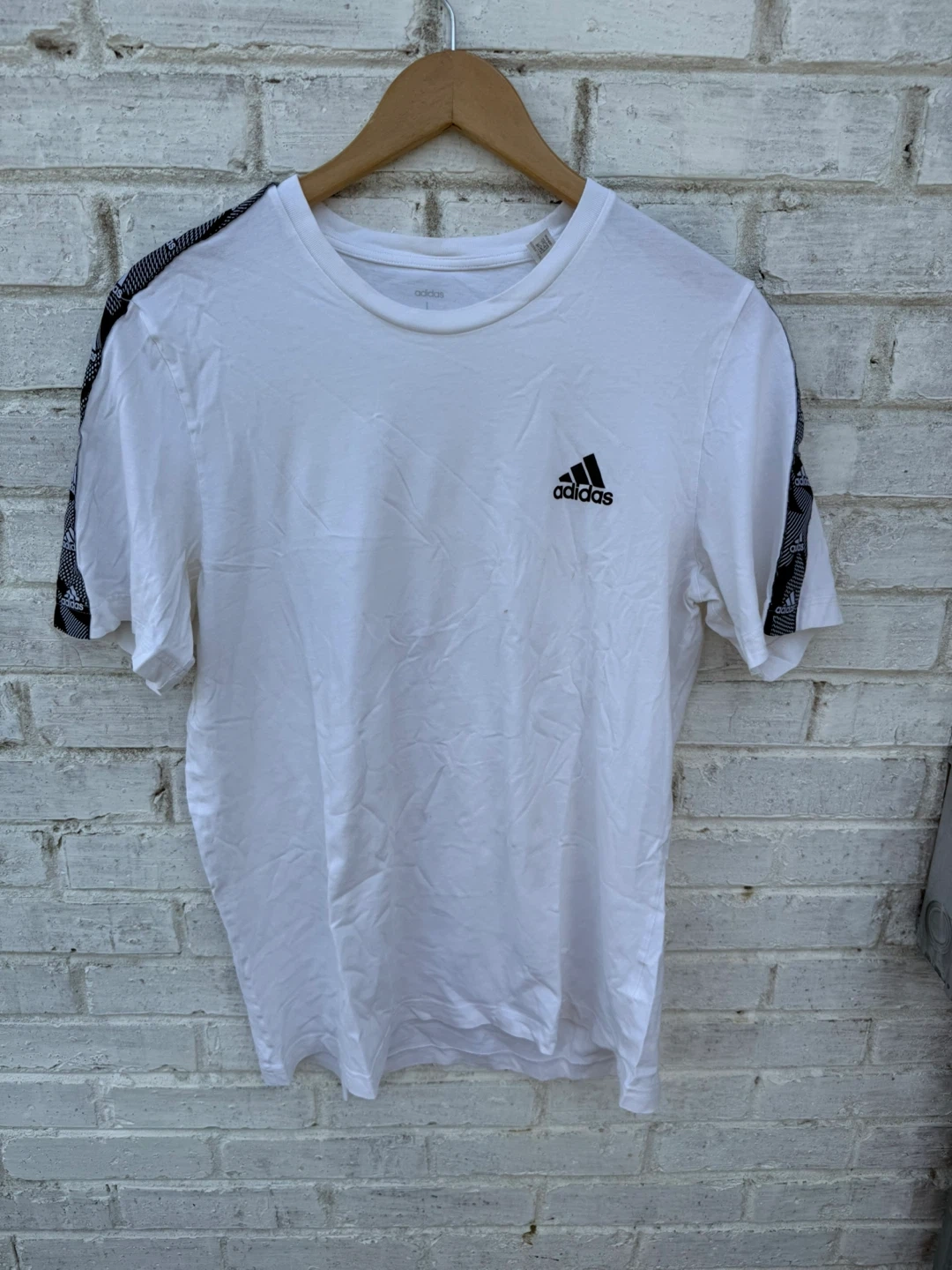 Selling an Adidas t-shirt in size large. It's white with the Adidas logo on the front and a cool design on the sleeves. Also available in gray!