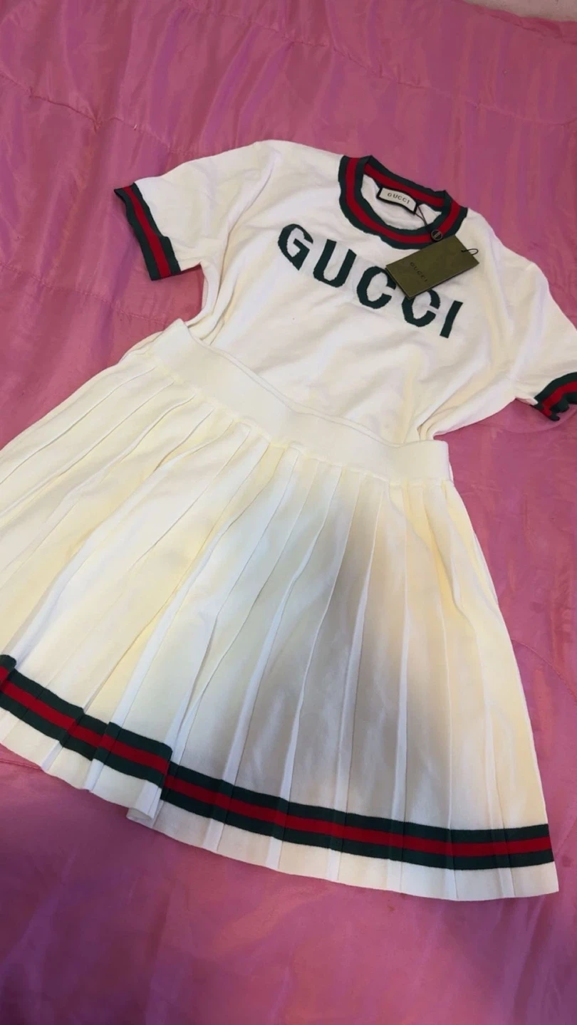 Selling a cute Gucci matching set! It includes a white t-shirt with the Gucci logo and a pleated skirt with green and red stripes. Perfect for a stylish and preppy look