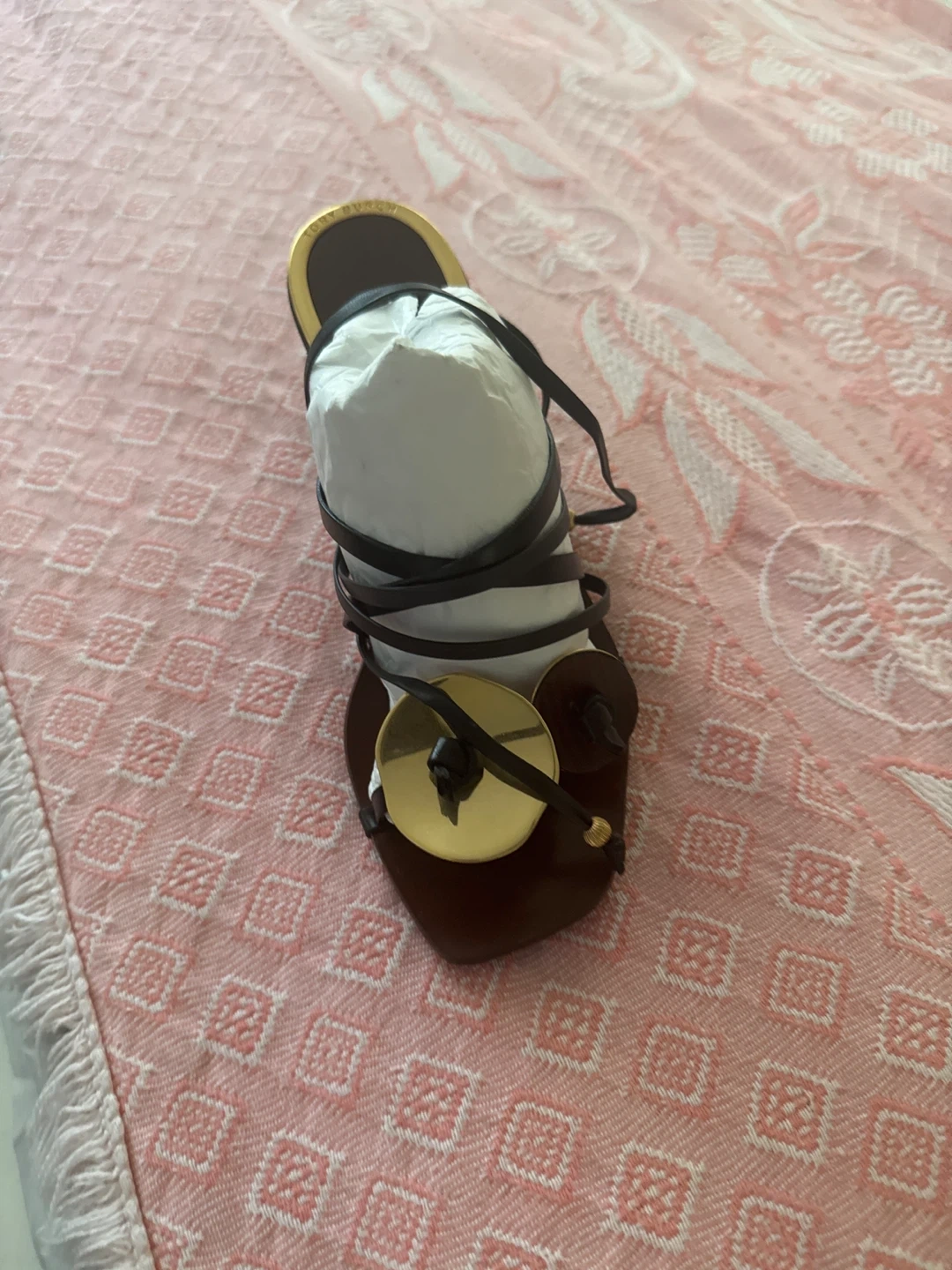 BY FAR strappy sandals in a dark brown leather. These shoes have a unique design with a gold accent. Perfect for a night out!