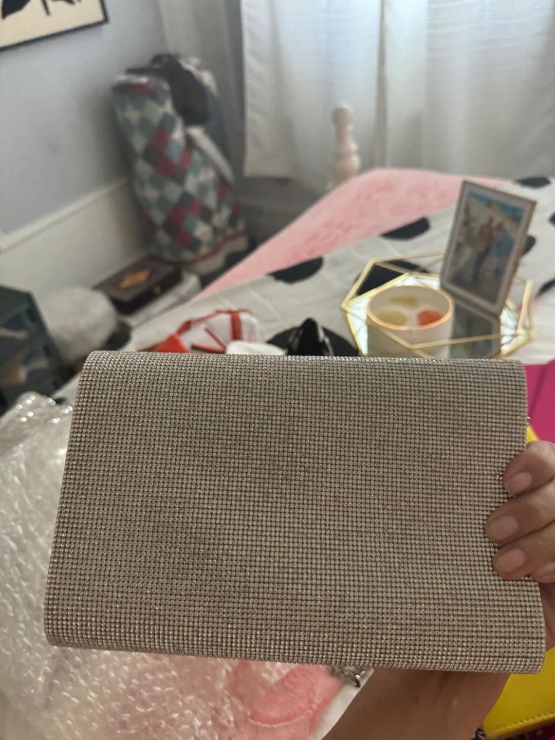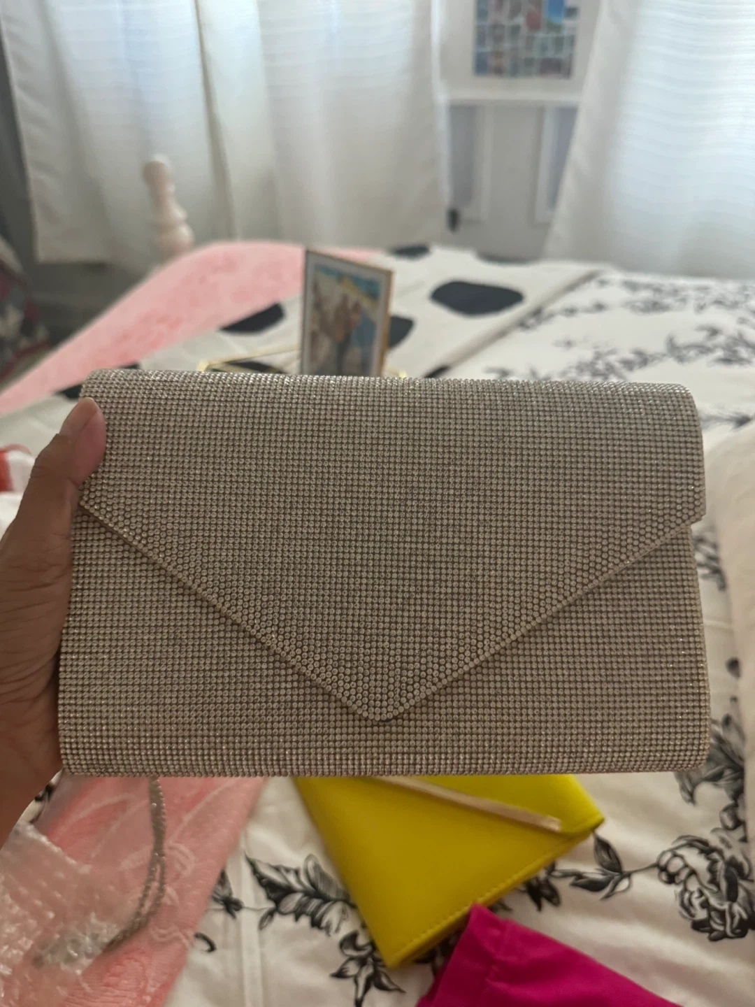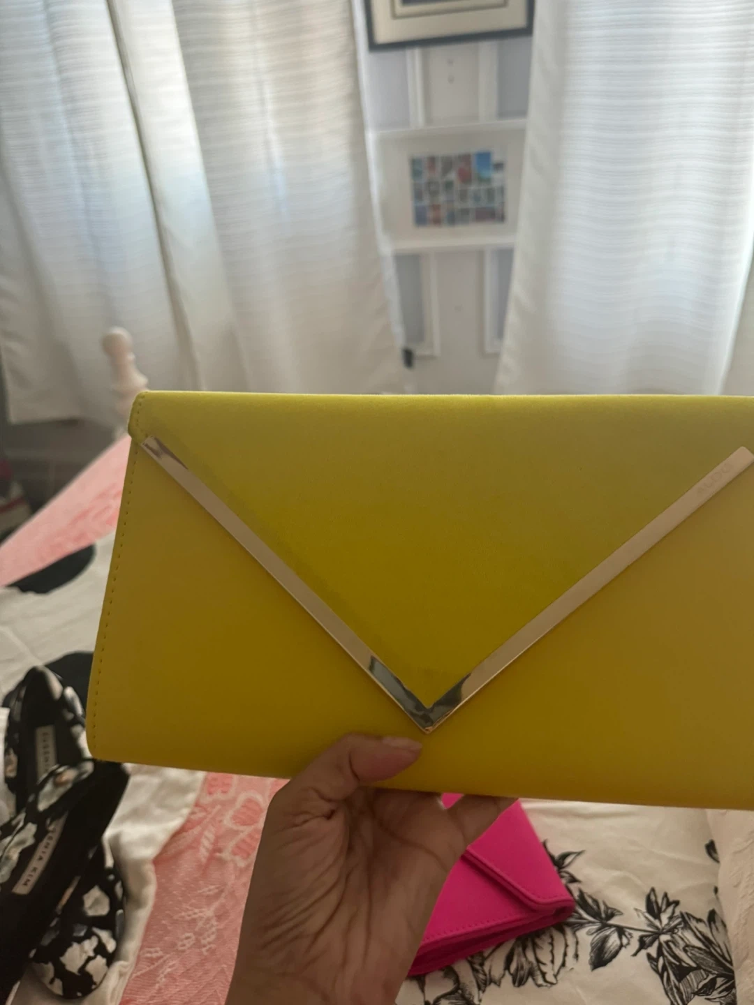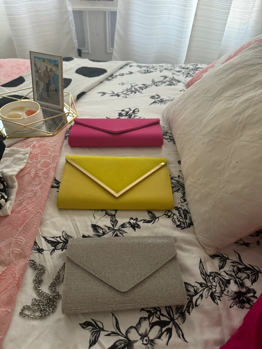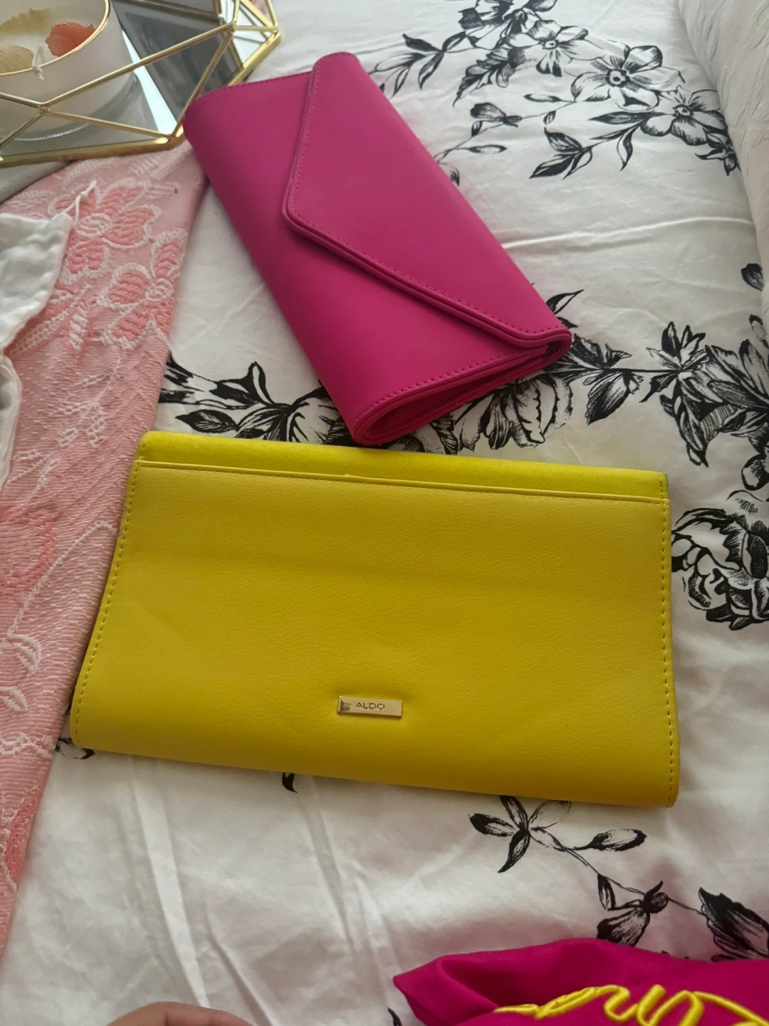 Selling three clutch purses! There's a pink one, a yellow Aldo clutch, and a silver one with a chain. They're all in great condition and ready for a night out