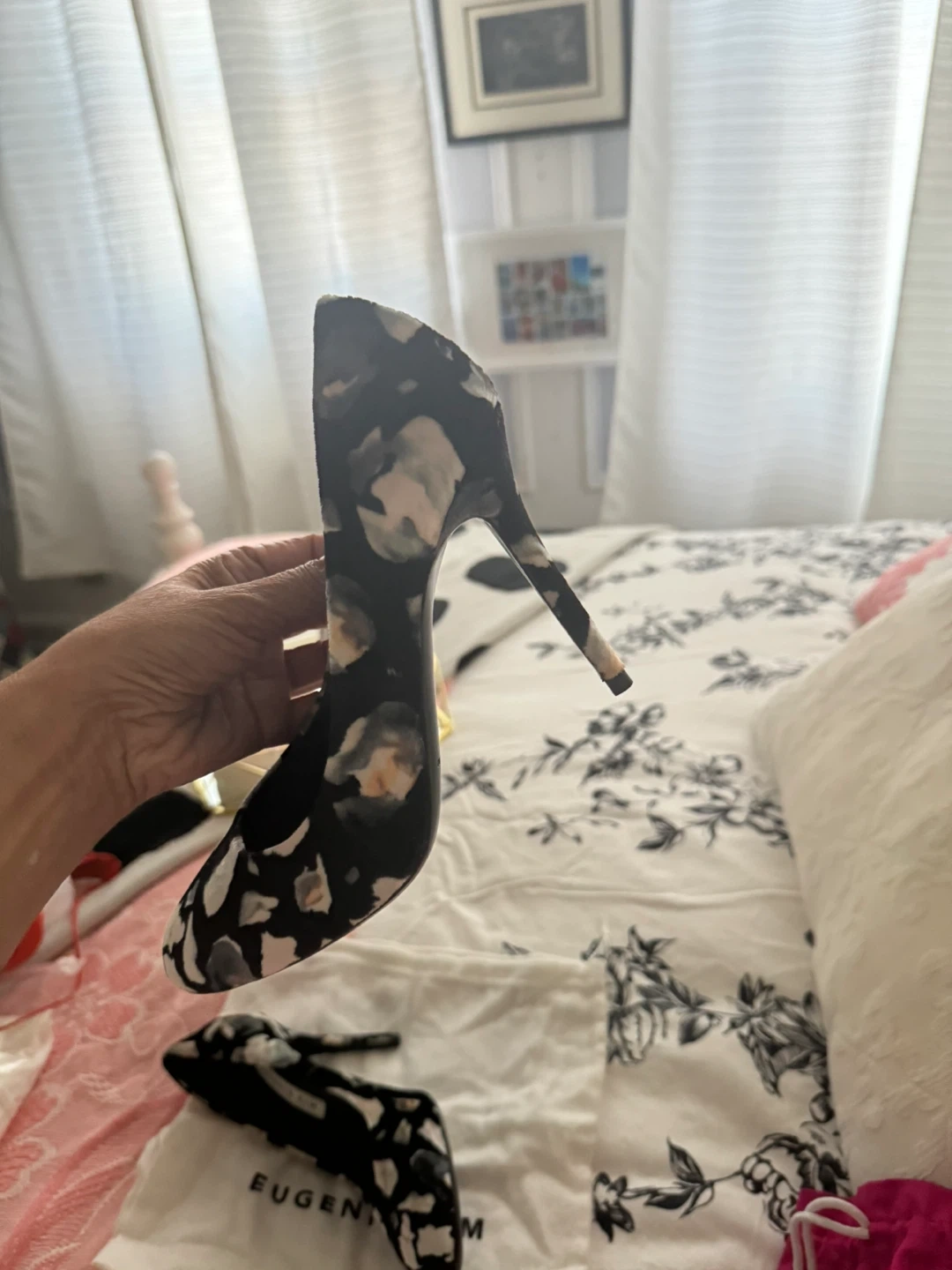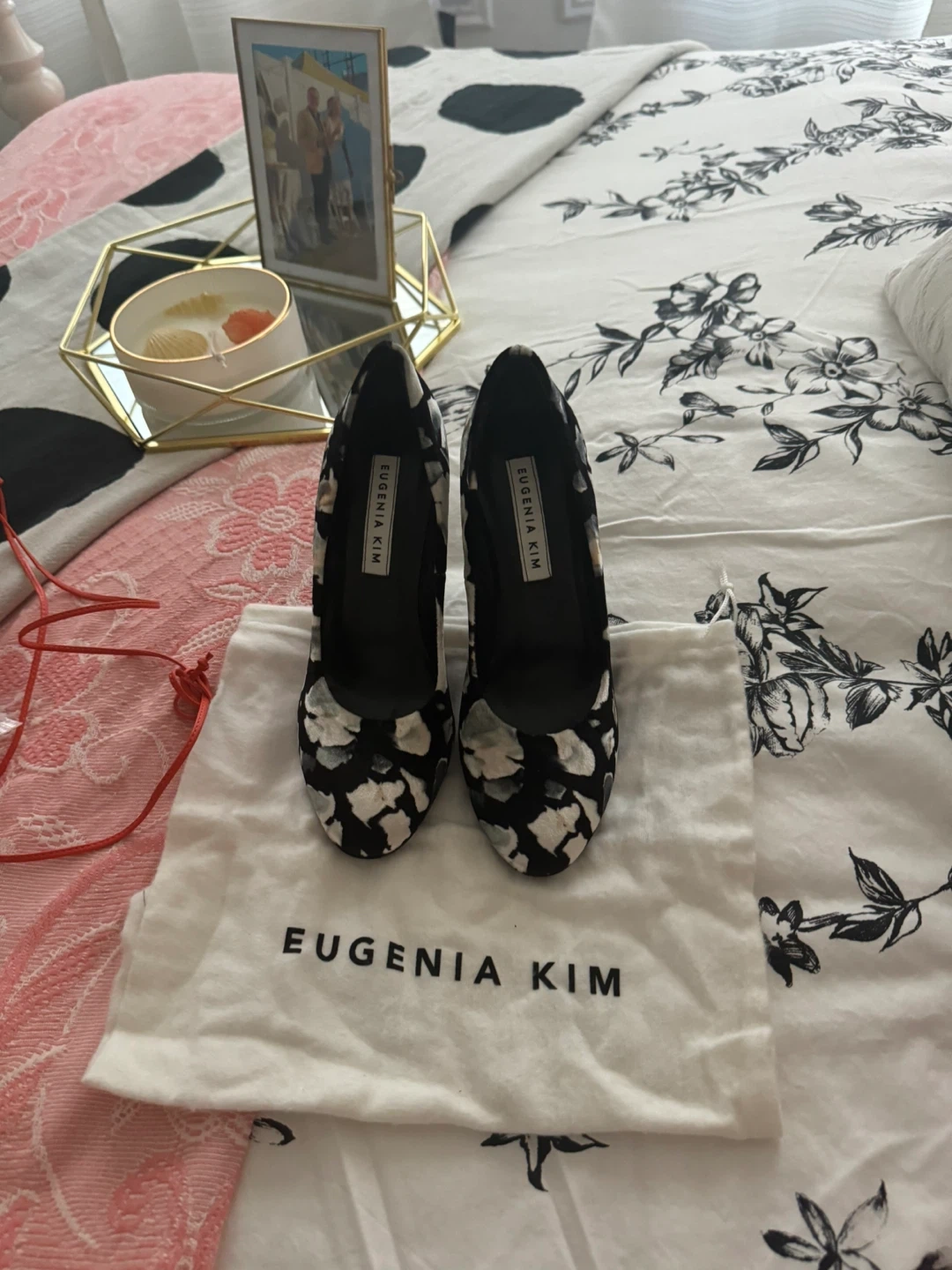 These Eugenia Kim heels feature a stylish floral print. They come with the original dust bag for storage and protection. Perfect for adding a touch of elegance to any outfit!