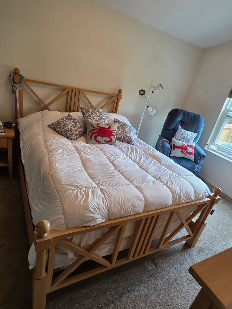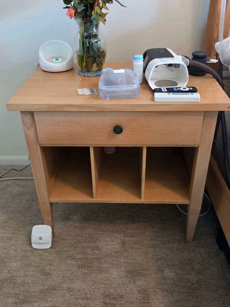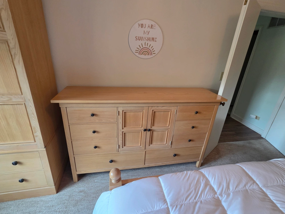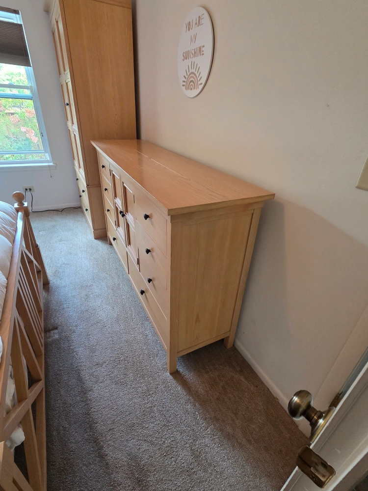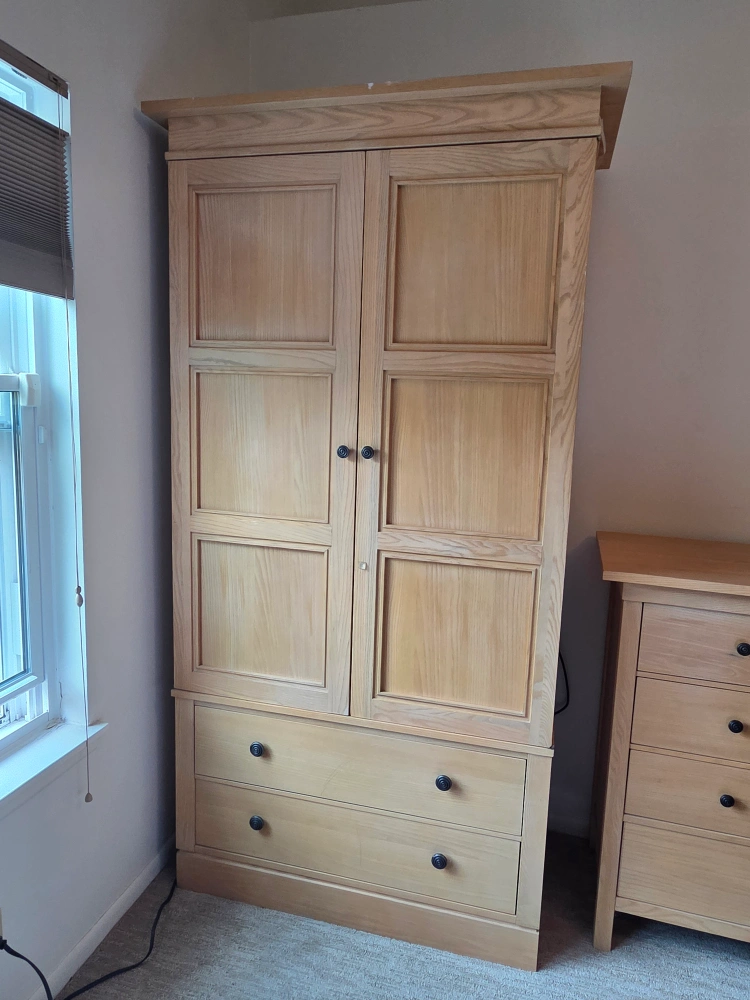 Selling a light wood wardrobe and dresser set. The set includes a wardrobe with drawers and shelves, a long dresser with multiple drawers, and a nightstand. They're in good condition and would be great for adding storage to any bedroom!