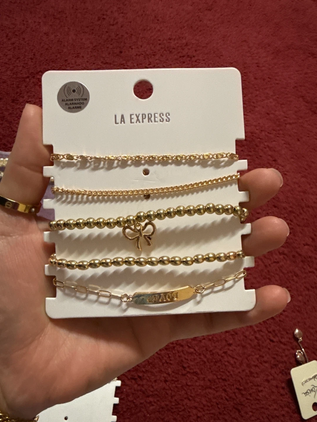 Selling a cute LA Express bracelet set! It features five separate bracelets in a gold tone, including a beaded bracelet with a bow charm and one with a 'LOVE' bar. Add a little sparkle to your wrist!