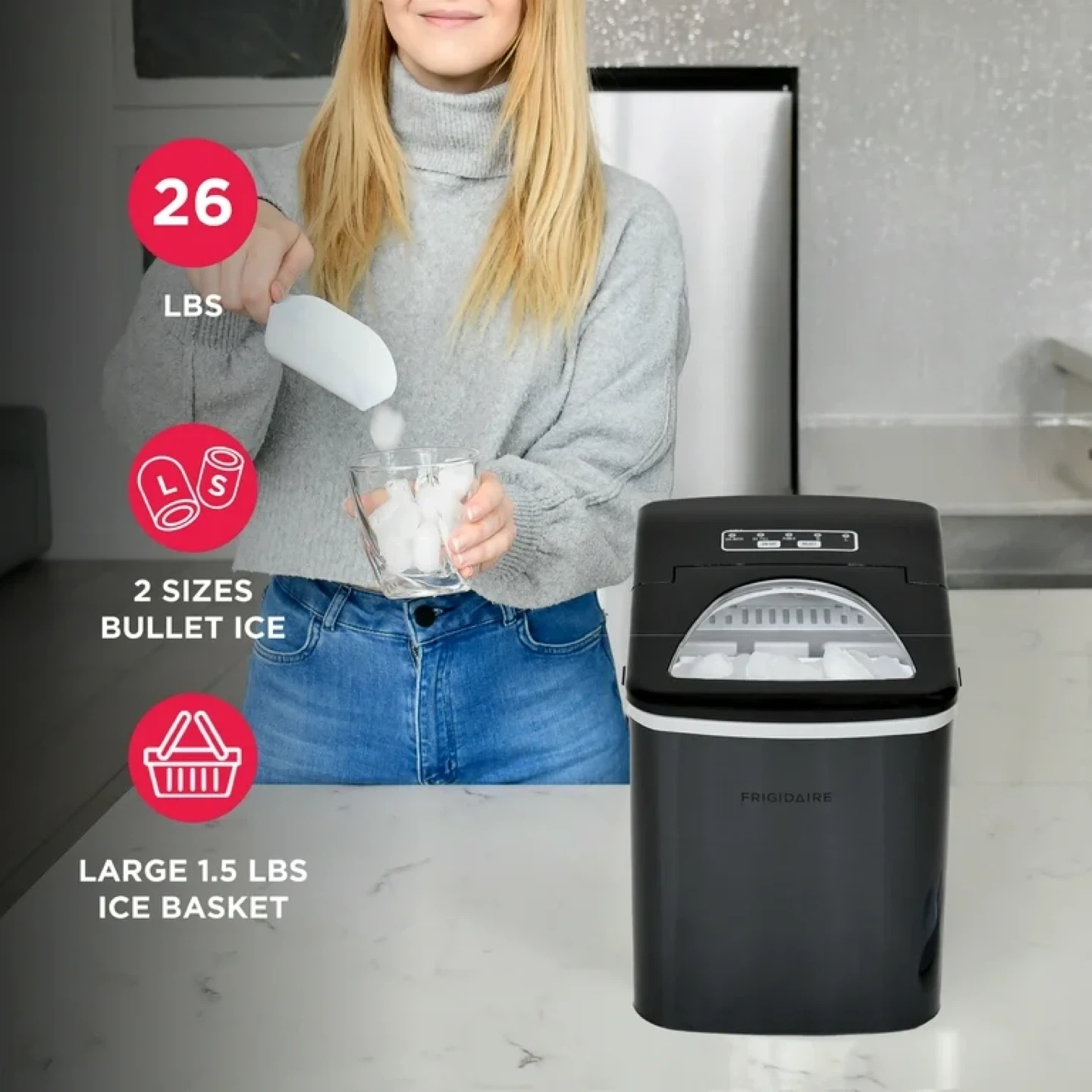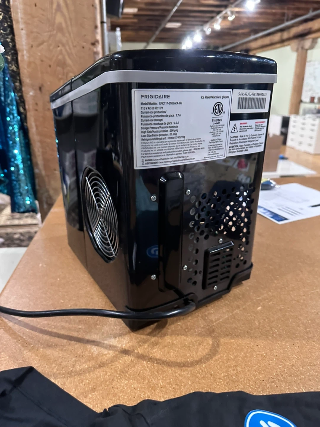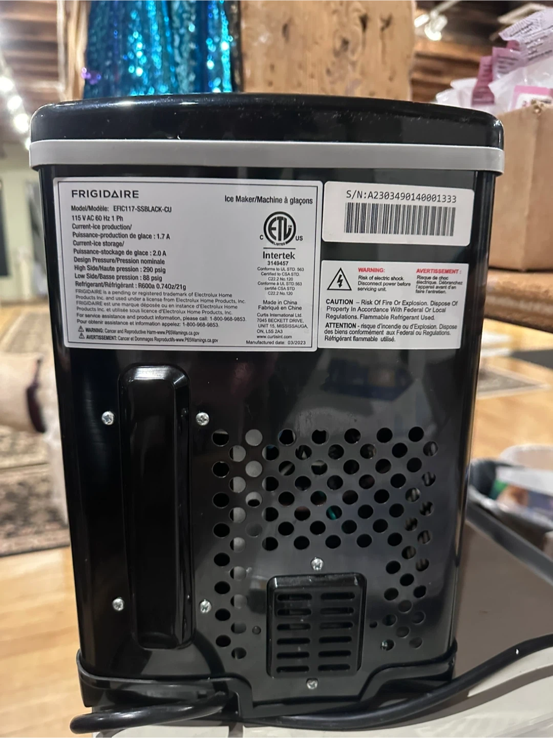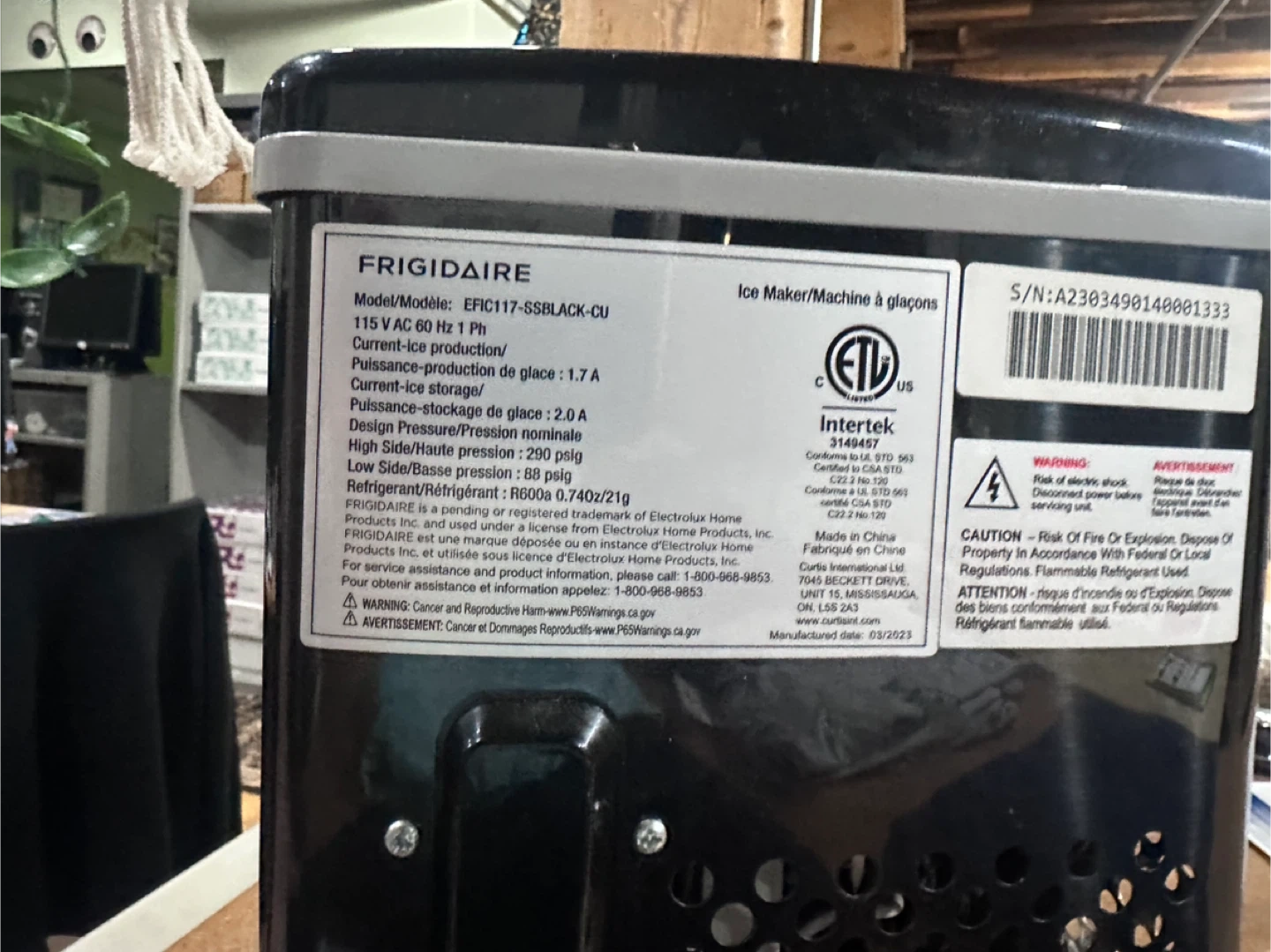 Selling a Frigidaire Ice Maker Machine, model EFIC117-SSBLACK-CU. It's in great condition and ready to make ice for you! It runs on 115 V AC 60 Hz 1 Ph and uses refrigerant R600a / 0.74OZ / 21g. Manufactured on 2023 March
