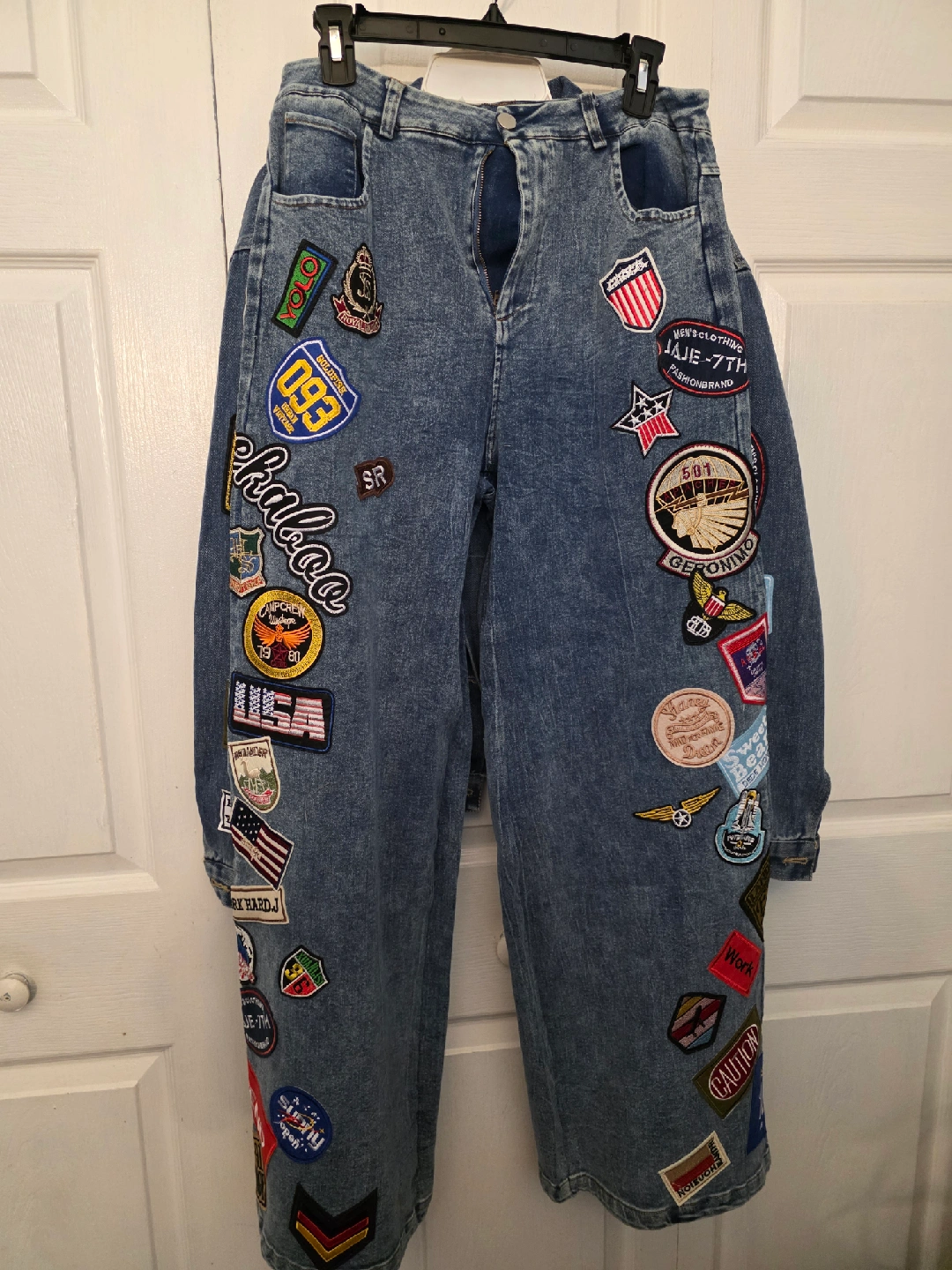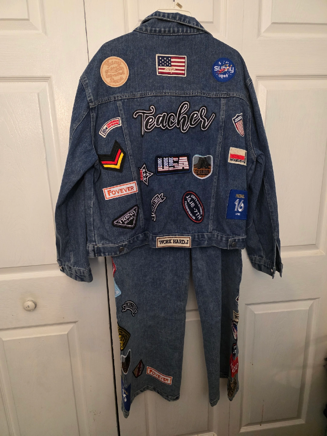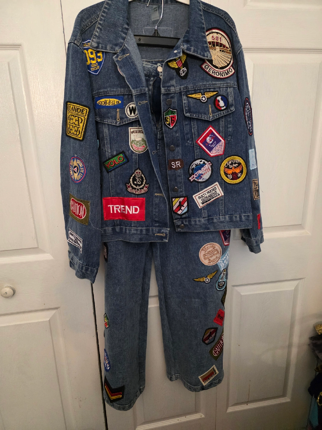 Denim jacket and jeans set with various patches. This unique set features a denim jacket and matching jeans, both adorned with an assortment of colorful and interesting patches. The size and brand are not specified, but it’s a stylish and eye-catching outfit!