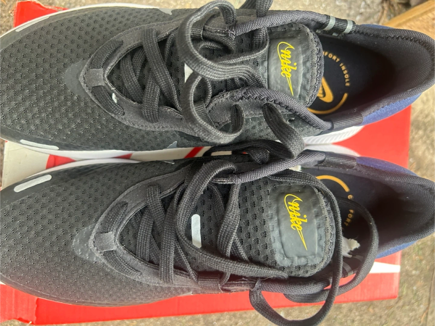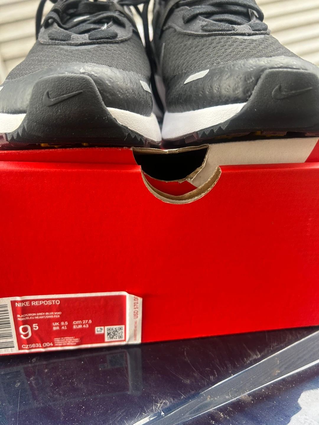 Selling a pair of Nike Reposto sneakers in black and grey. They are a men's size 9.5 and come with the original box. The shoes feature a comfortable insole and a stylish design. Perfect for everyday wear or workouts!