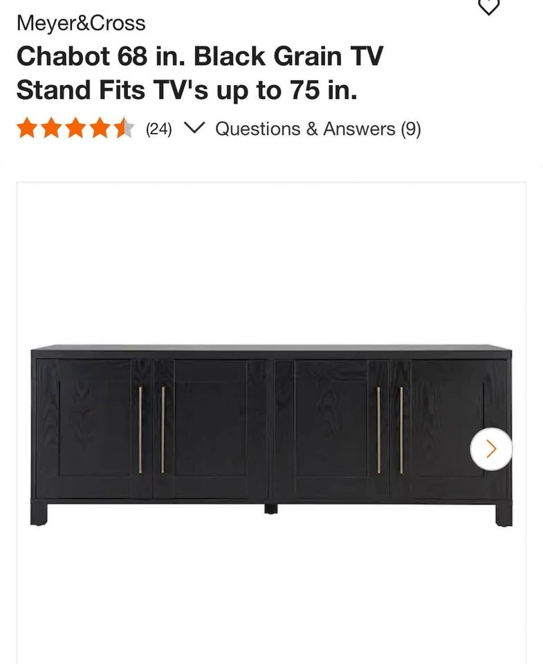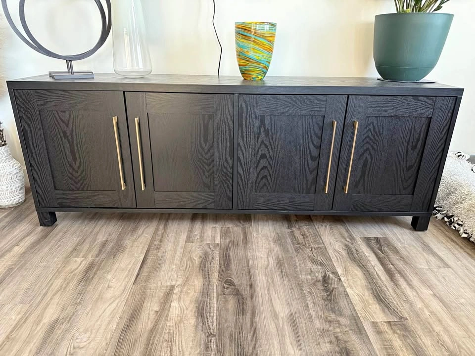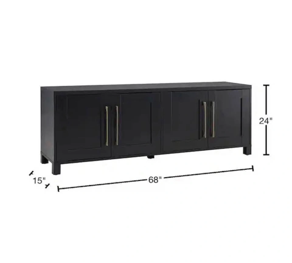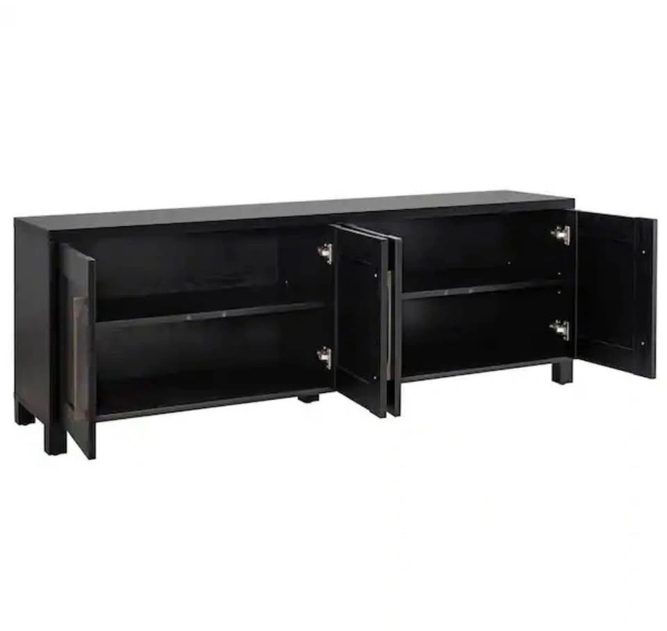 Accommodates TVs up to 75 in. Constructed of sturdy MDF materials in a handcrafted Black Grain finish. Features four doors with enclosed cabinets and 4 shelves for ample storage. The top has a weight capacity of 75lbs. Lower shelves can hold 25lbs. each.