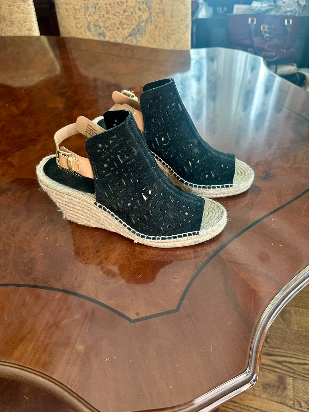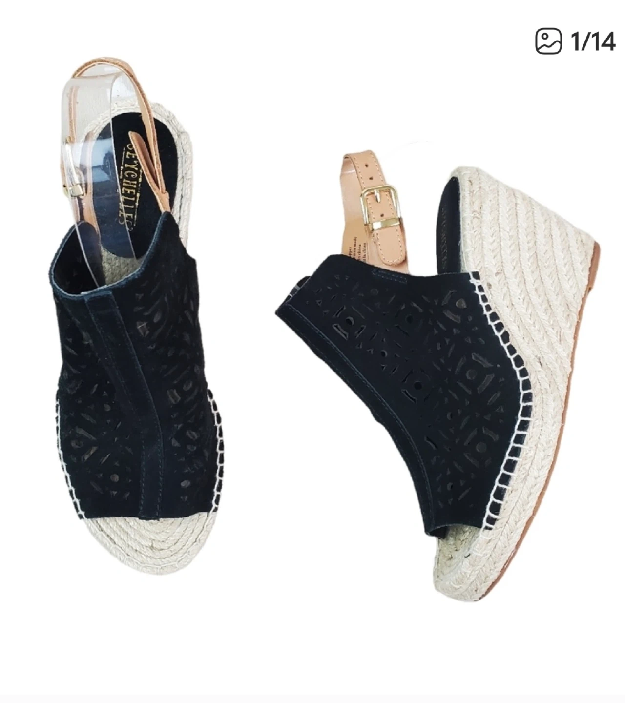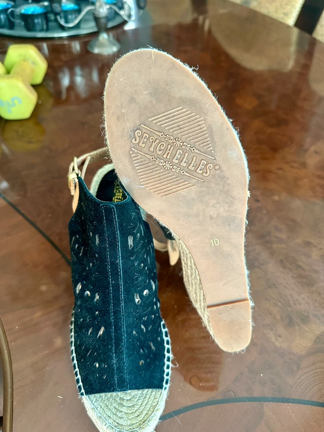 21These Seychelles wedge sandals are a stylish addition to any wardrobe! They feature a black suede upper with a laser-cut design and a comfortable espadrille wedge heel. The adjustable ankle strap ensures a secure fit. These are in good condition and ready for a new home
