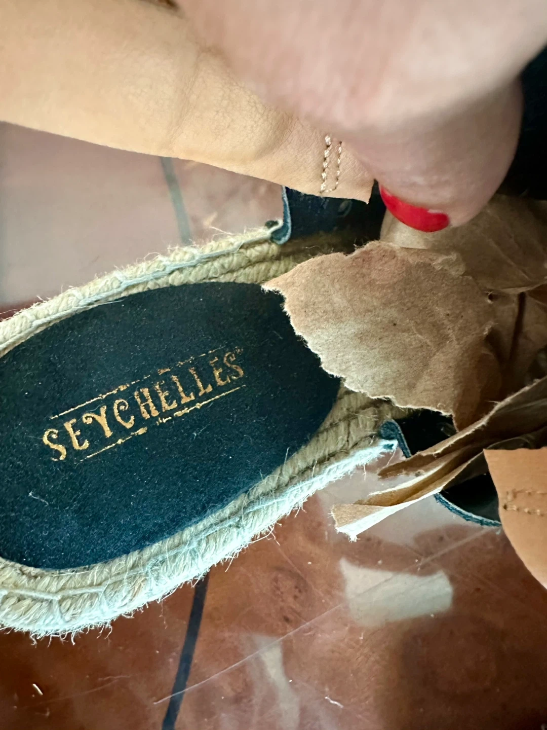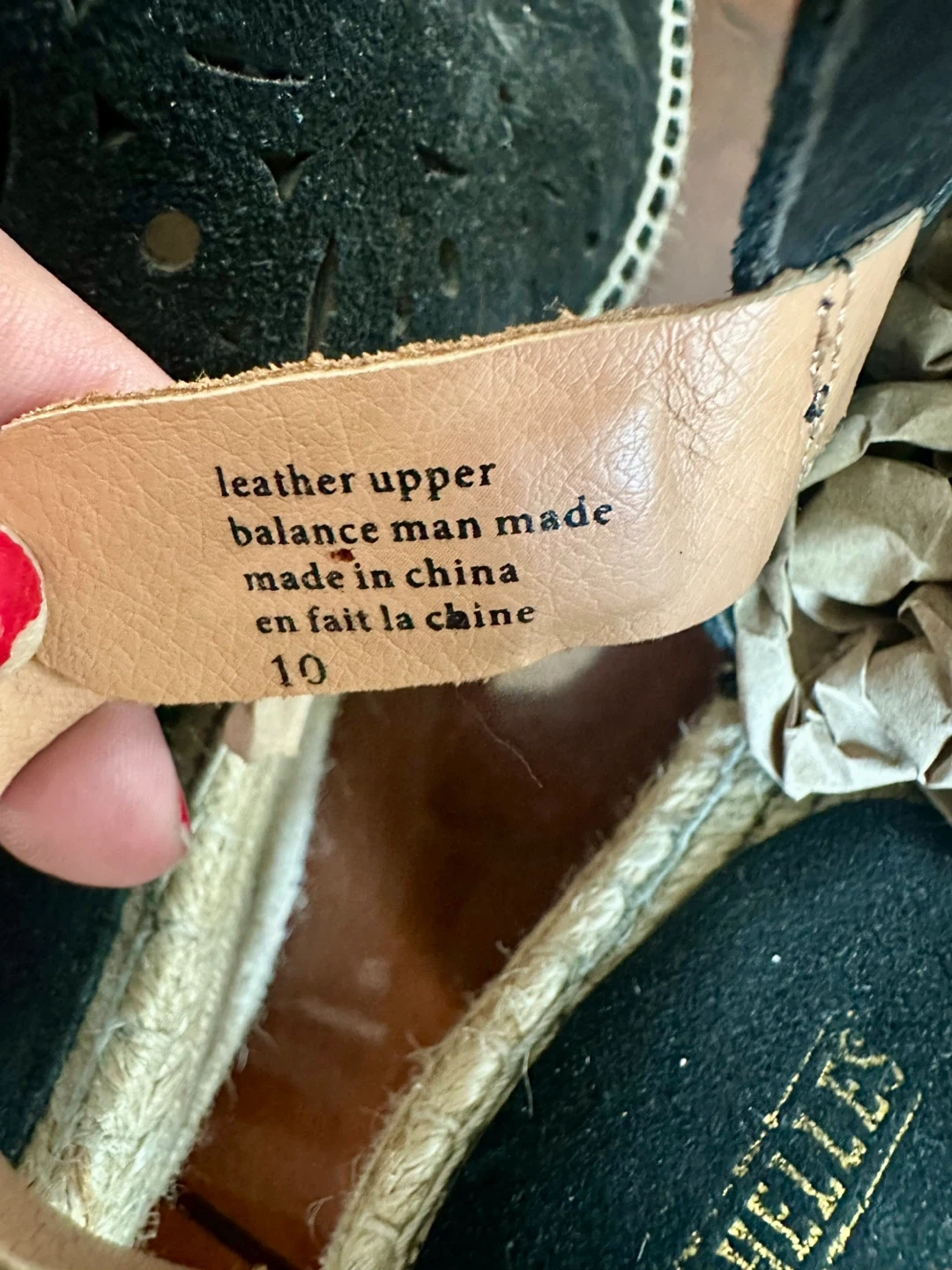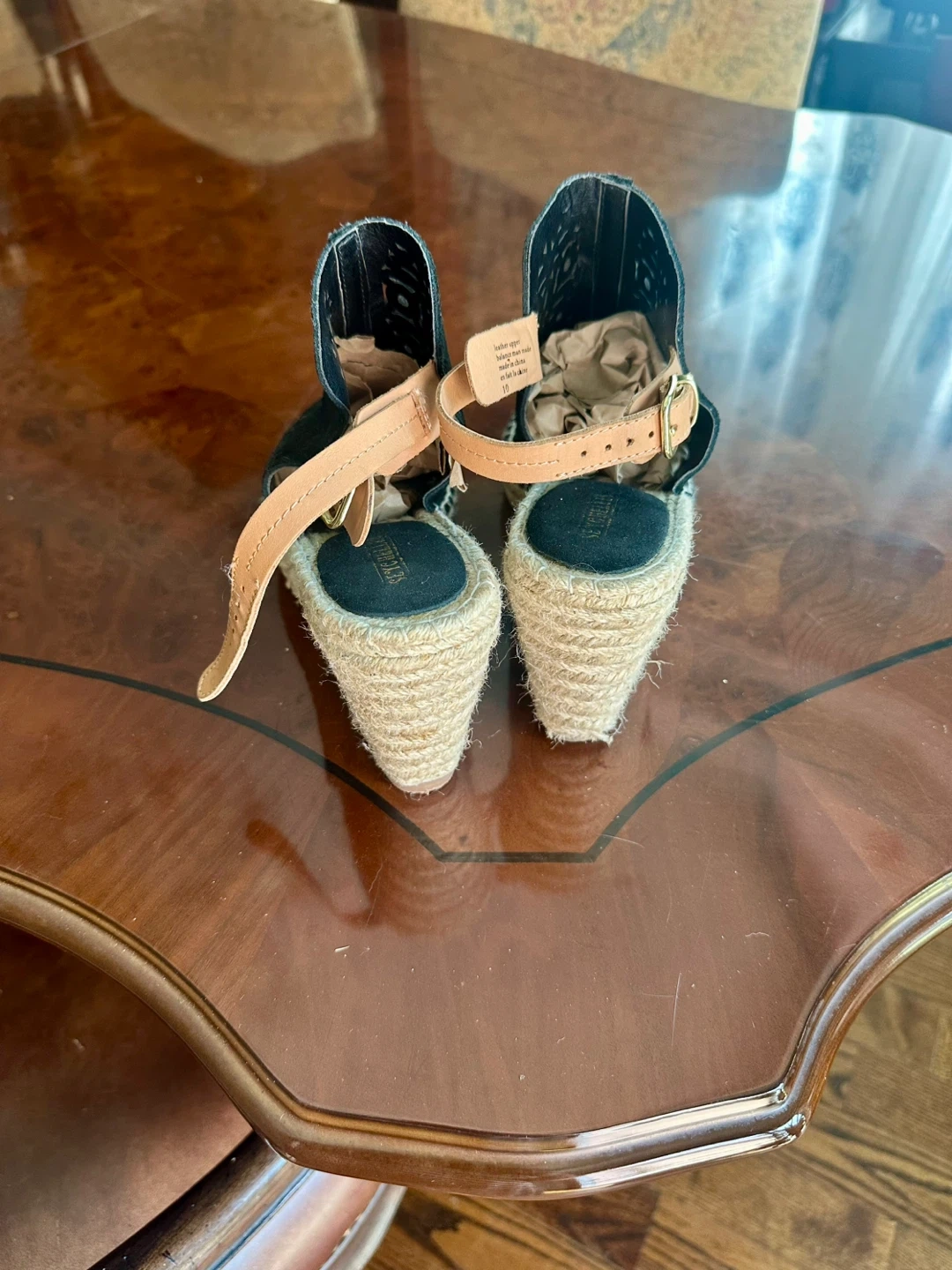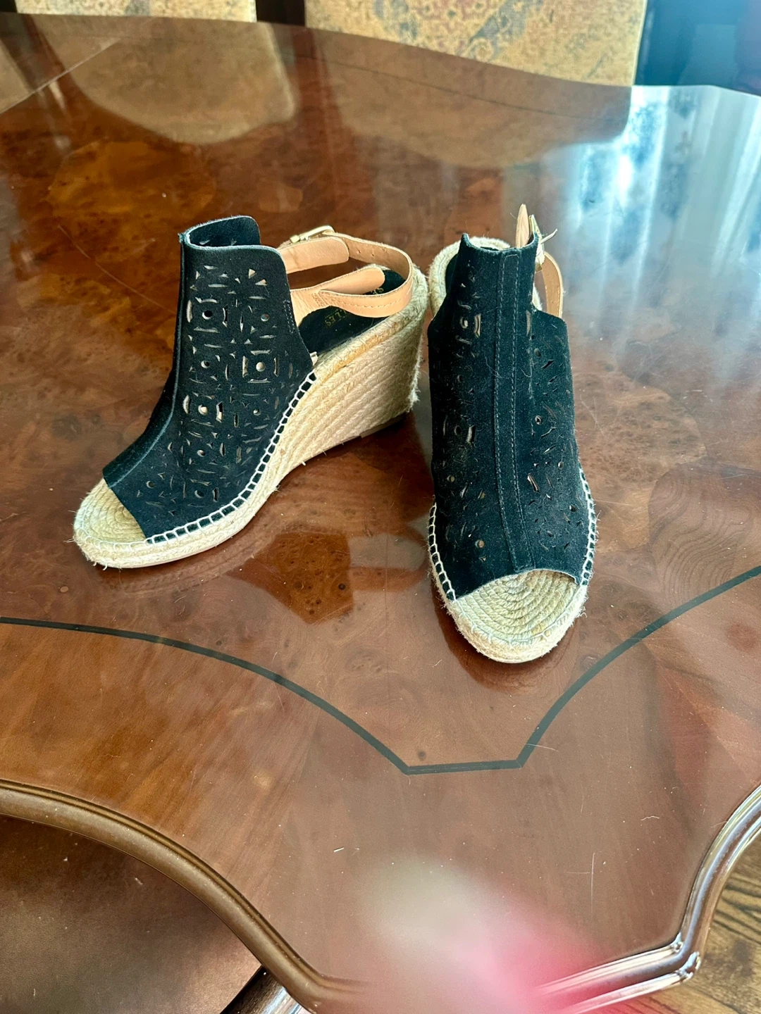 21These Seychelles wedge sandals are a stylish addition to any wardrobe! They feature a black suede upper with a laser-cut design and a comfortable espadrille wedge heel. The adjustable ankle strap ensures a secure fit. These are in good condition and ready for a new home