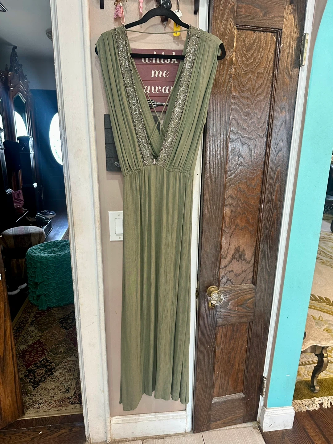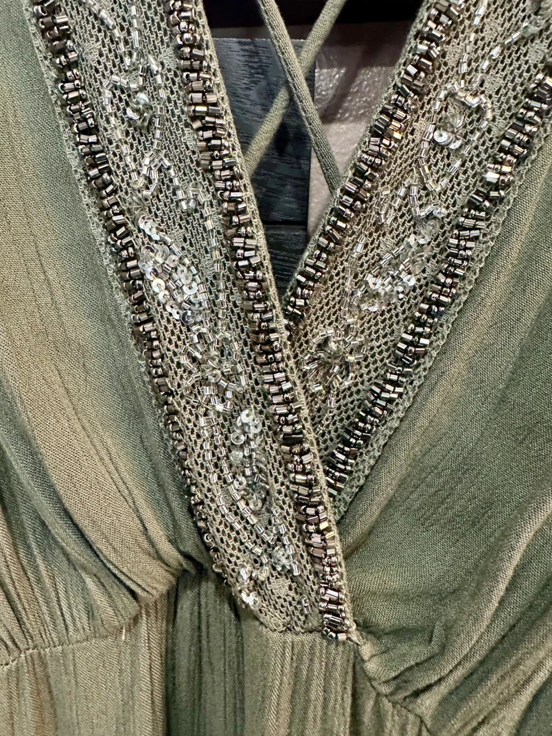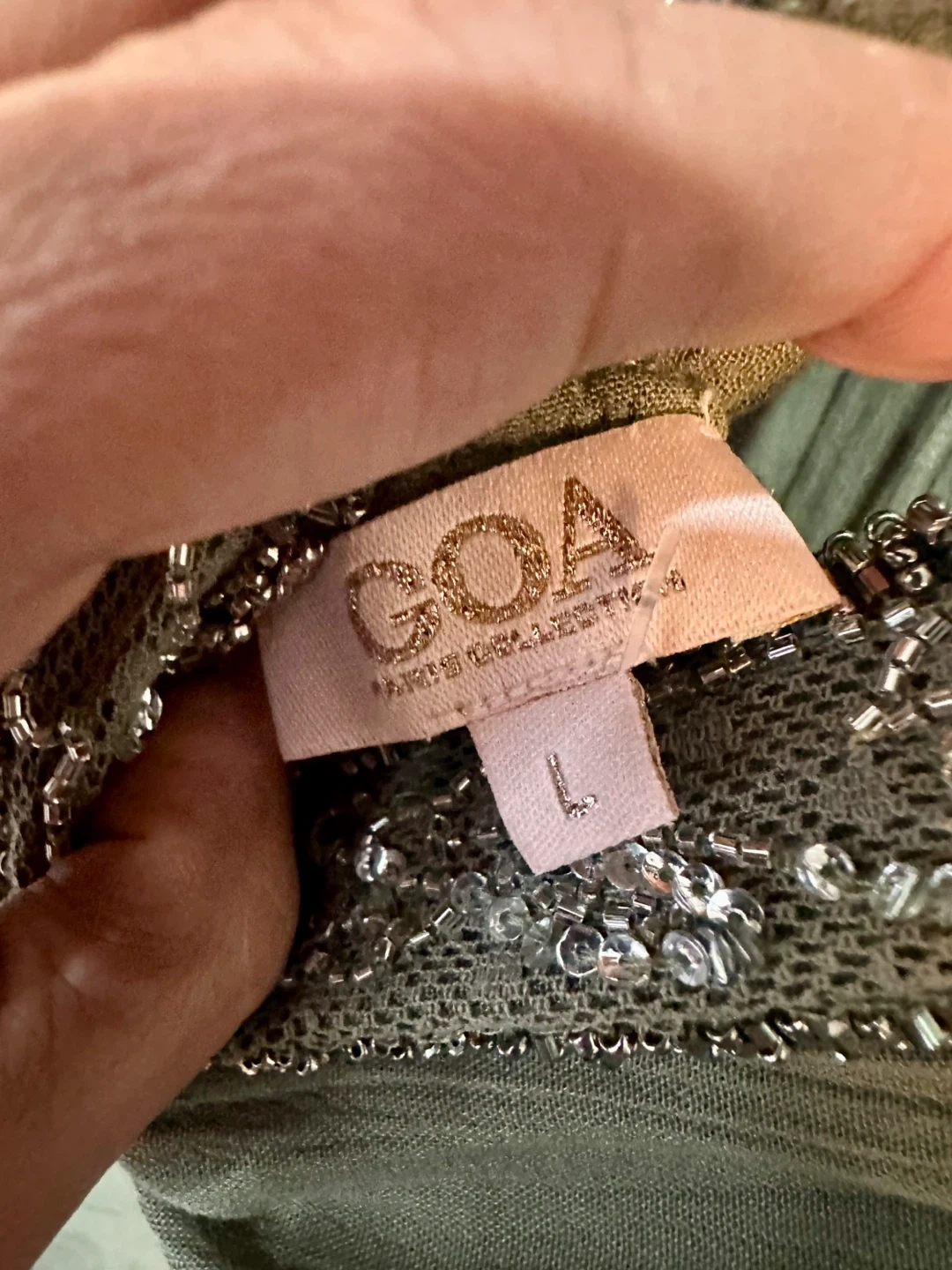 21I'm selling a beautiful GOA maxi dress in olive green! It's a size L and features lovely beaded detailing around the neckline. The dress has a flattering V-neck and a comfortable, flowy fit. Perfect for a special occasion or a stylish everyday look!