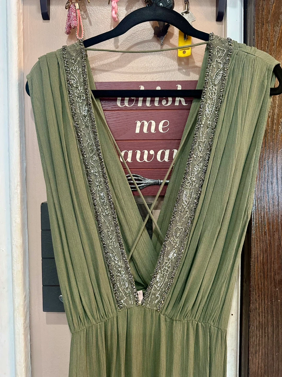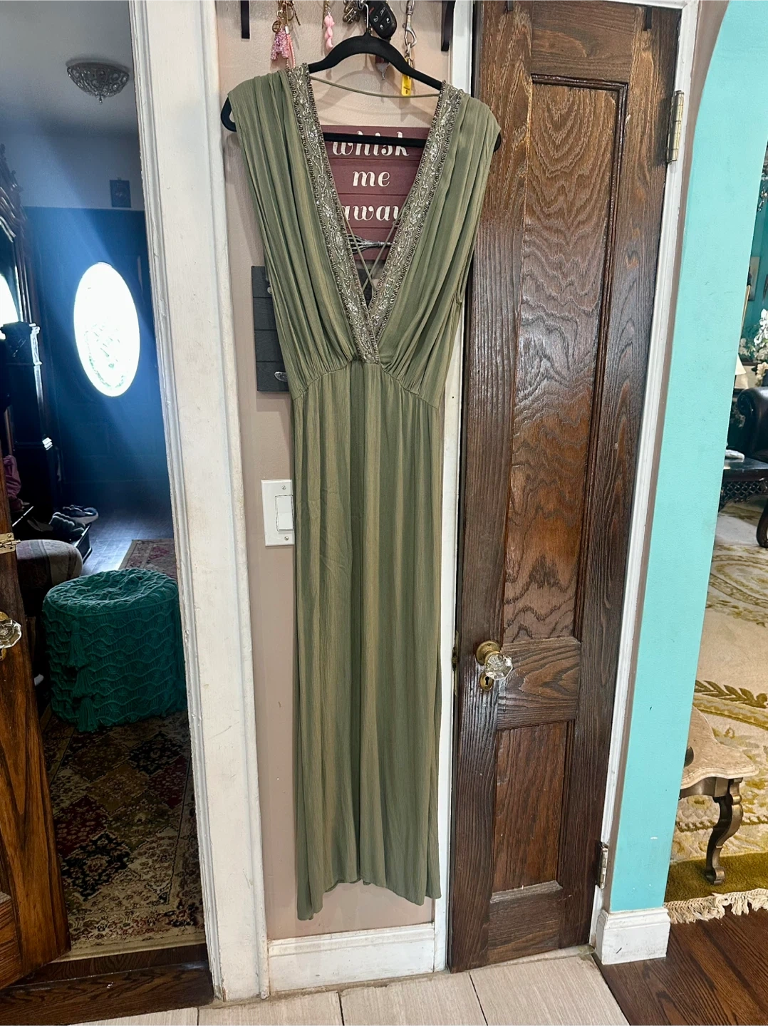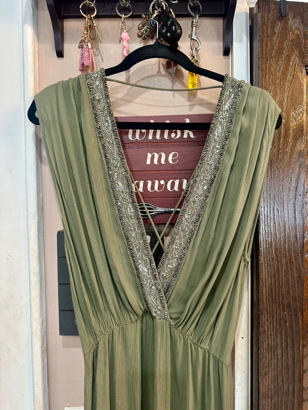 21I'm selling a beautiful GOA maxi dress in olive green! It's a size L and features lovely beaded detailing around the neckline. The dress has a flattering V-neck and a comfortable, flowy fit. Perfect for a special occasion or a stylish everyday look!