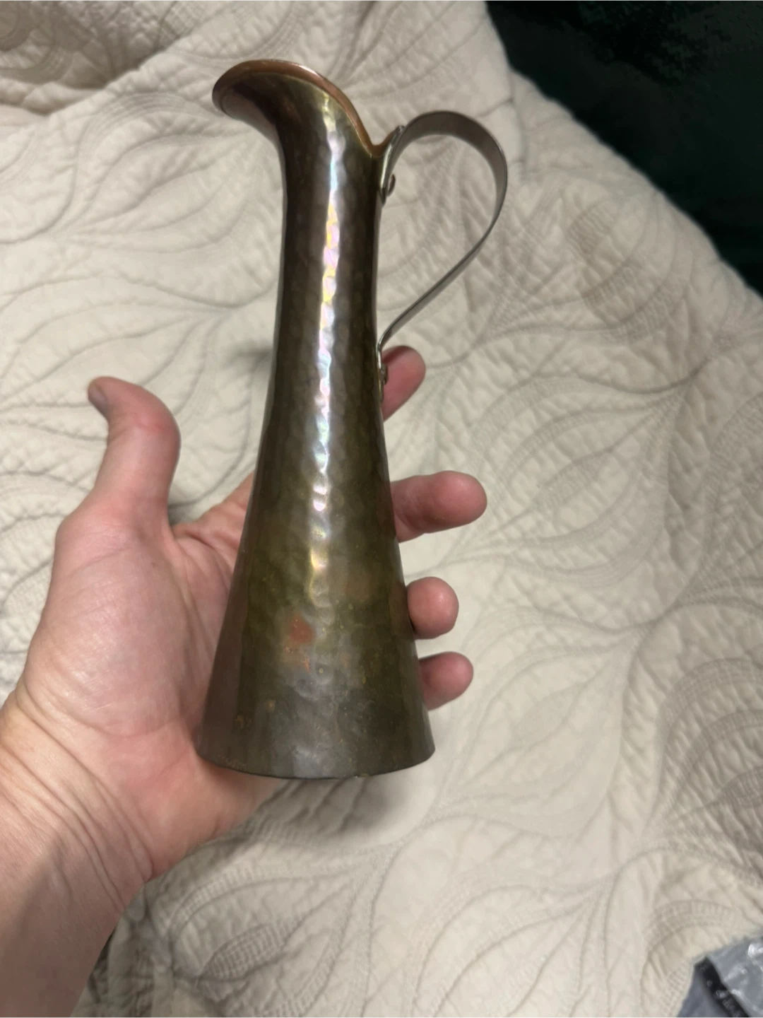 60Selling a vintage hammered copper pitcher. It has a unique, rustic look and a delicate handle. Perfect for adding a touch of vintage charm to your home decor!