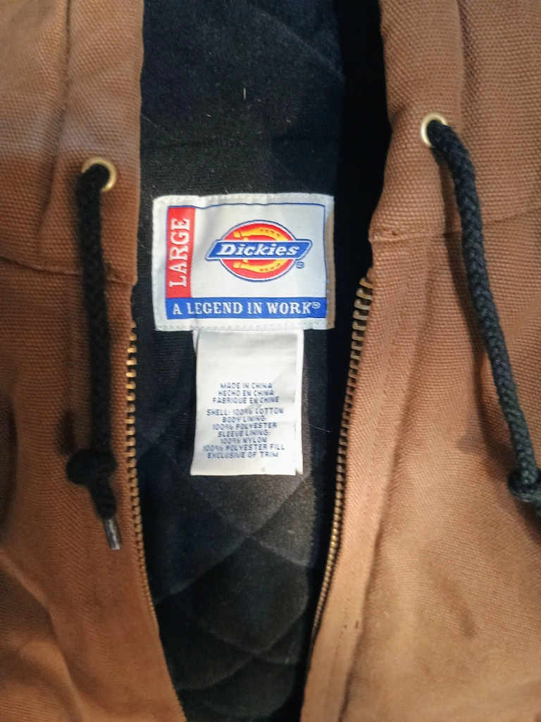 I'm selling a Dickies hooded jacket in size large! It's a brown color and has a black interior. The outer shell is made of 100% cotton and the lining is 100% polyester. It's a great jacket for work or everyday wear!