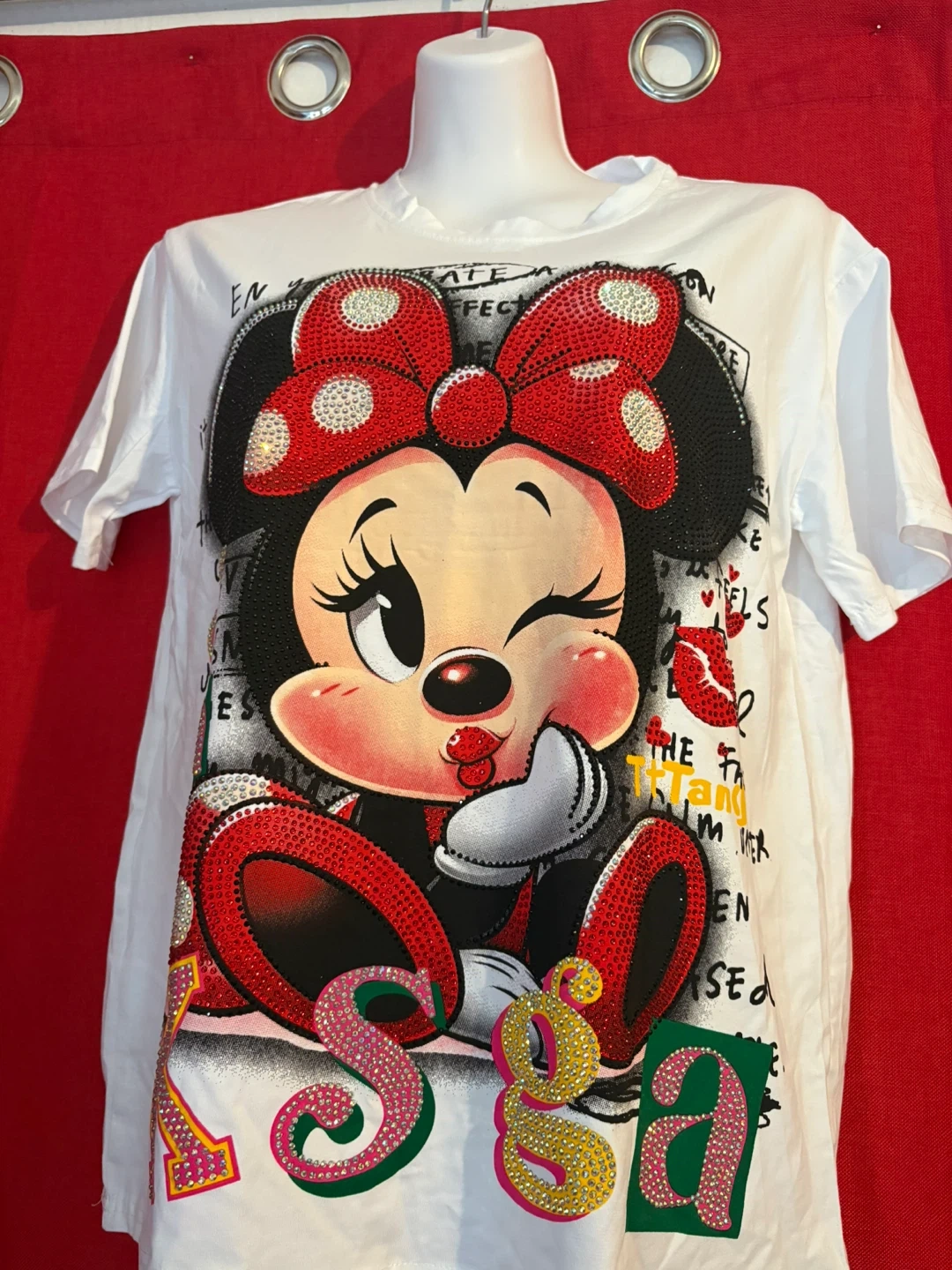 Cute Minnie Mouse T-shirt in white! The design features Minnie Mouse with a sparkly red bow and other fun details. Perfect for any Disney fan!