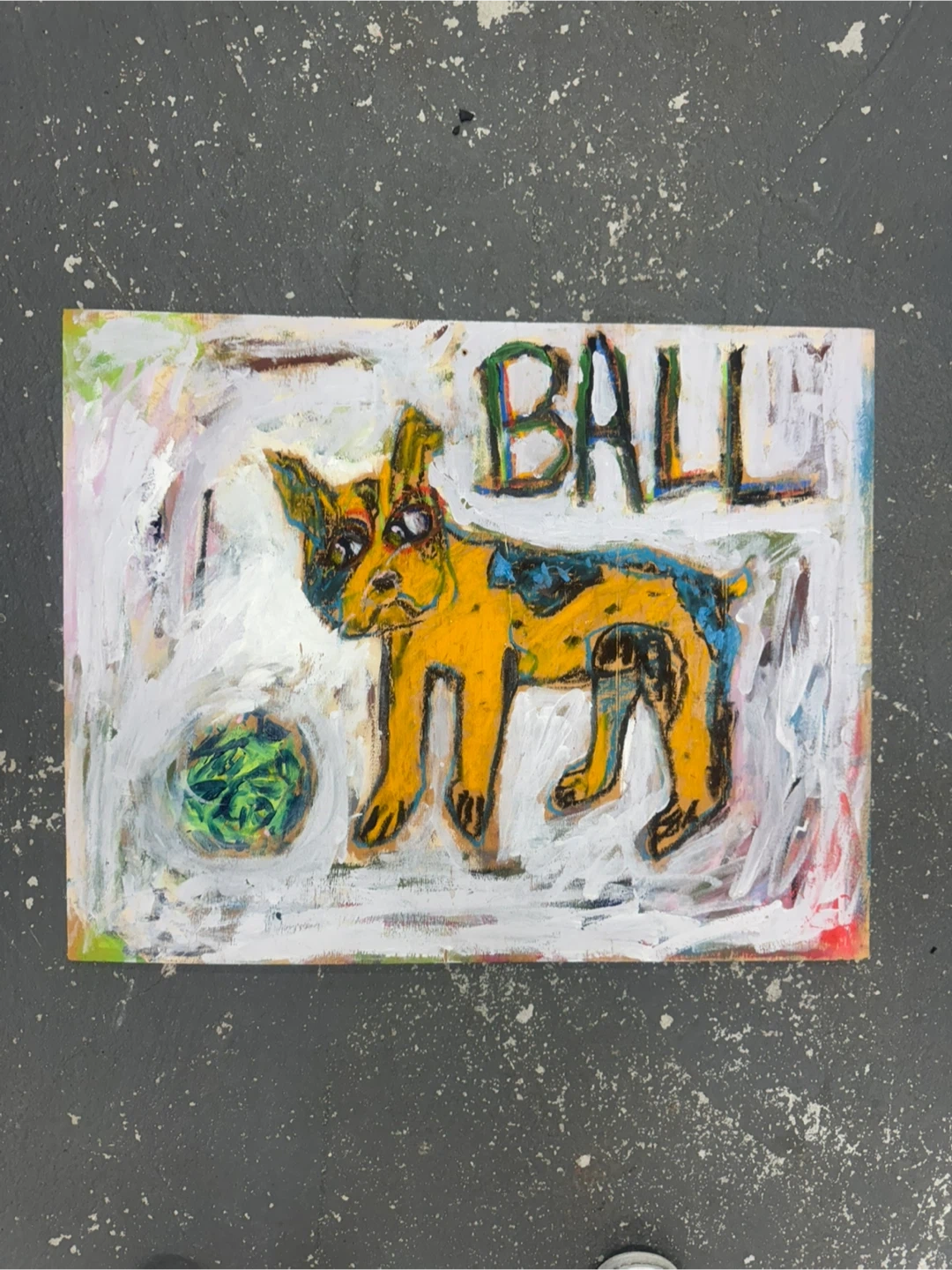 This is a painting of a yellow dog with the word 'BALL' written above it. It would be a great addition to any art collection 2ft X 19 in Painting by M.Fox