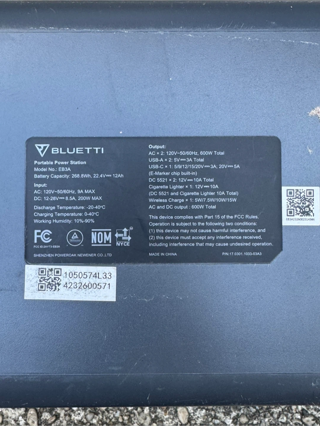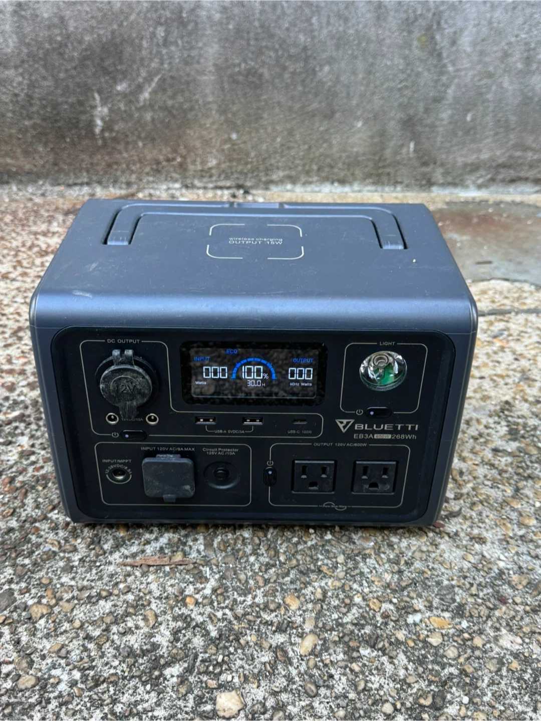 89Selling a Bluetti EB3A portable power station! It has a battery capacity of 268.8Wh and a model number of EB3A. It supports AC and DC output, USB-C, and wireless charging with a 15W output. Great for camping or emergency power!