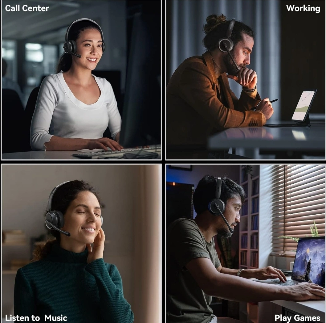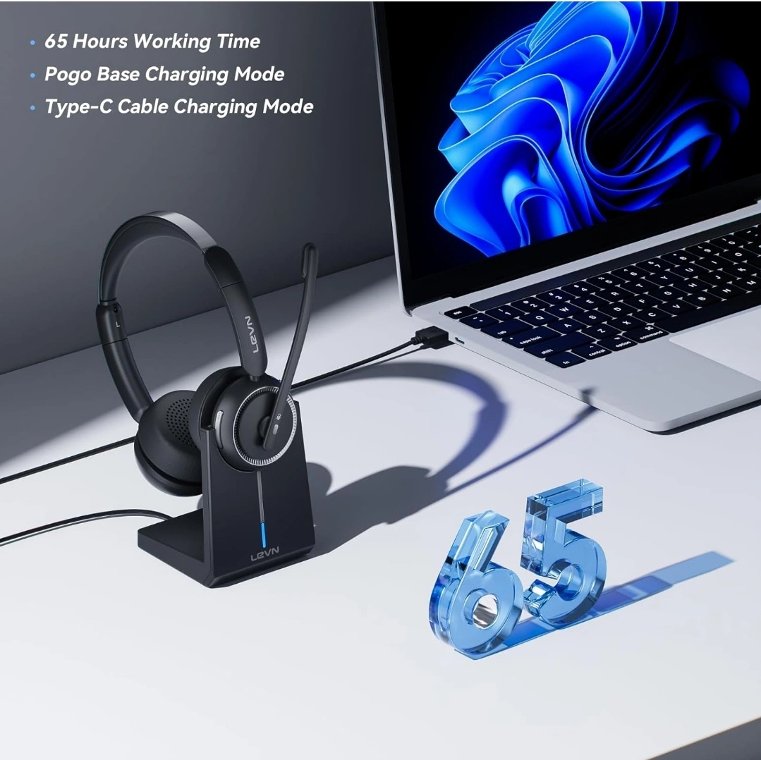 Selling a LEVN Bluetooth 5.2 headset! It comes with a charging base and a USB dongle for connection. It features: - Two connection methods: Bluetooth 5.2 or USB dongle - AI noise technology that filters out 99.99% background noise - Up to 65 hours of working time - Pogo base charging mode and Type-C cable charging mode