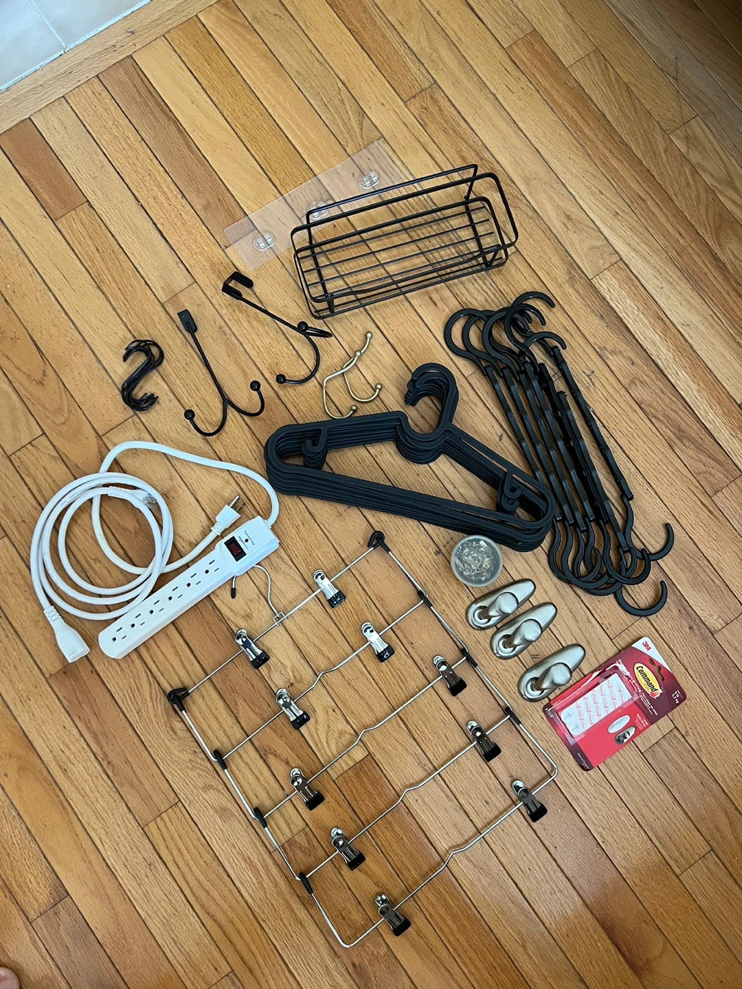 20Selling all of this as a bundle, pick up in Chelsea this weekend -10x plastic black hangers, medium sized -white extension outlet + extension cord -2x black over the door hooks -7x black S shaped hooks - can be used for hanging scarfs/bags or kitchen items etc -1x clamp hanger for skirts/pants -1x black wall basket with new/never used adhesive hooks -3x silver command hooks with 3x new adhesives -gold picture wall hooks - approx 15-20 in the package -2x gold wall hooks (no screws included) -6x layered/space savings hangers - can fit 5 hangers on each
