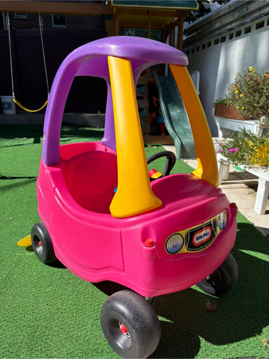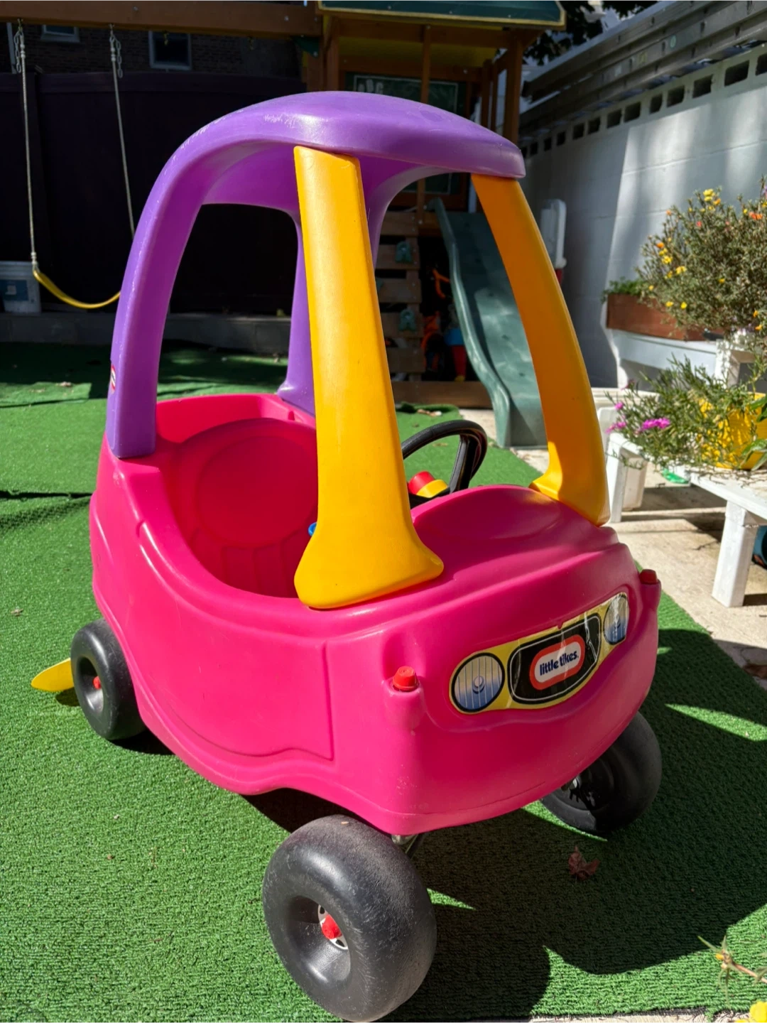 Selling a Little Tikes Cozy Coupe car in pink, purple, and yellow! It's a fun ride-on toy for kids. Perfect for outdoor adventures and imaginative play