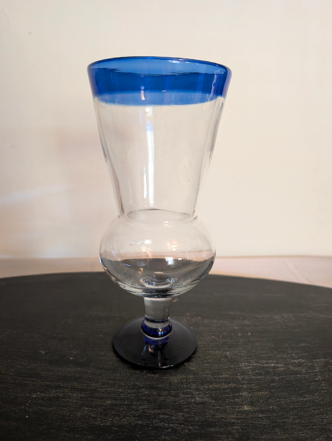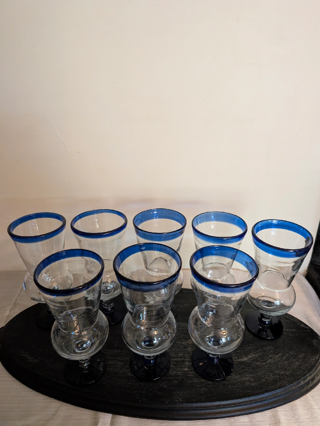 I'm selling a set of 8 Margarita glasses. They are clear glass with a cobalt blue rim and a unique shape. Perfect for cocktail hour!