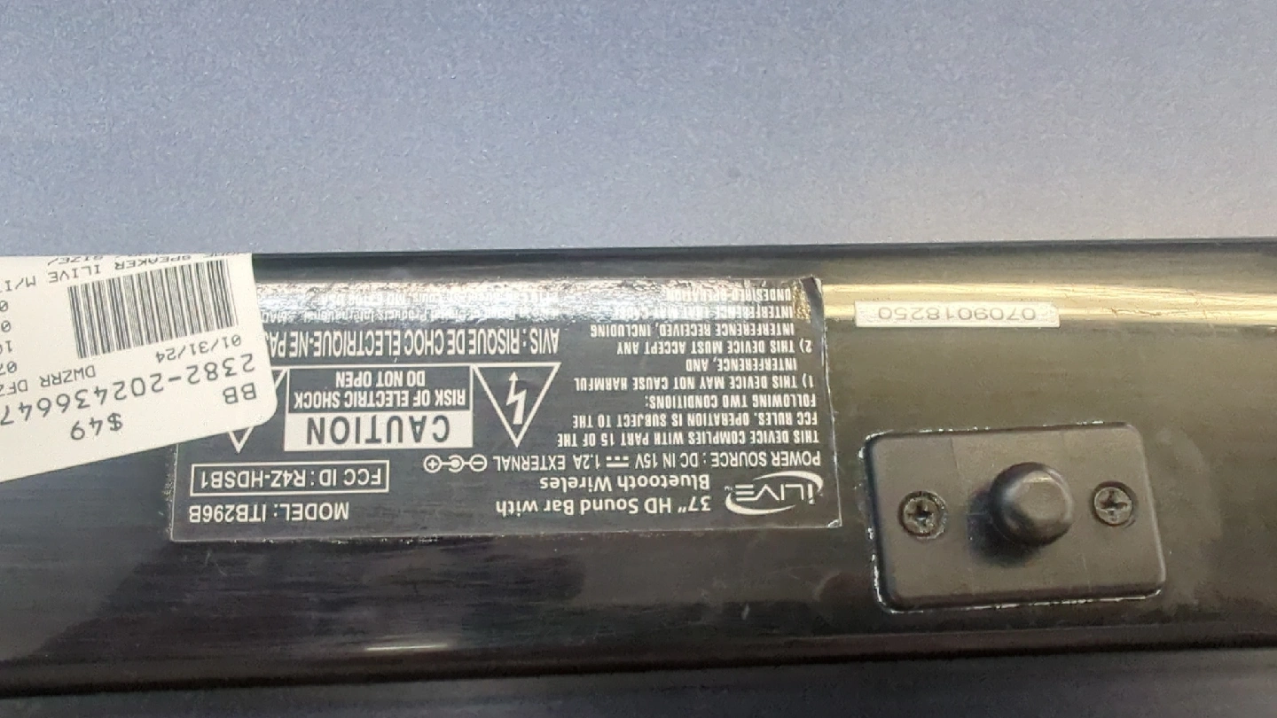 Selling an iLive 37" HD Sound Bar with Bluetooth Wireless. It's model ITB296B. The sound bar requires a power source of DC IN: 15V 1.2A EXTERNAL. We offer layaway Ask for Alonso Message me for location