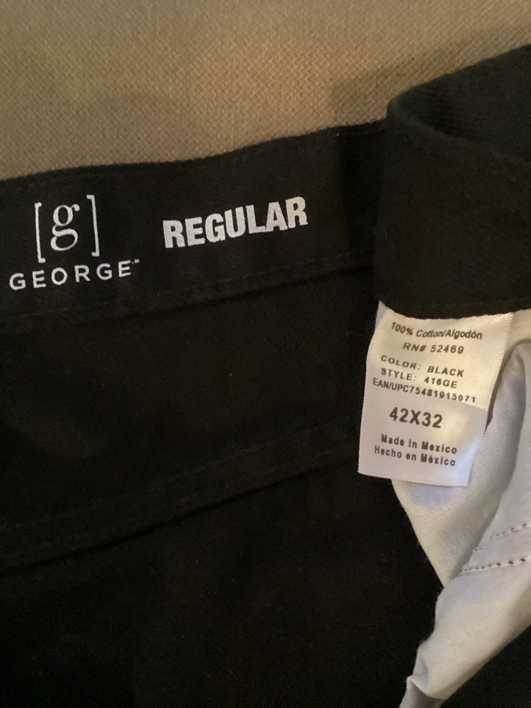 I'm selling a pair of George brand regular fit jeans. They are black and size 42x32. These jeans are made in Mexico and are 100% cotton