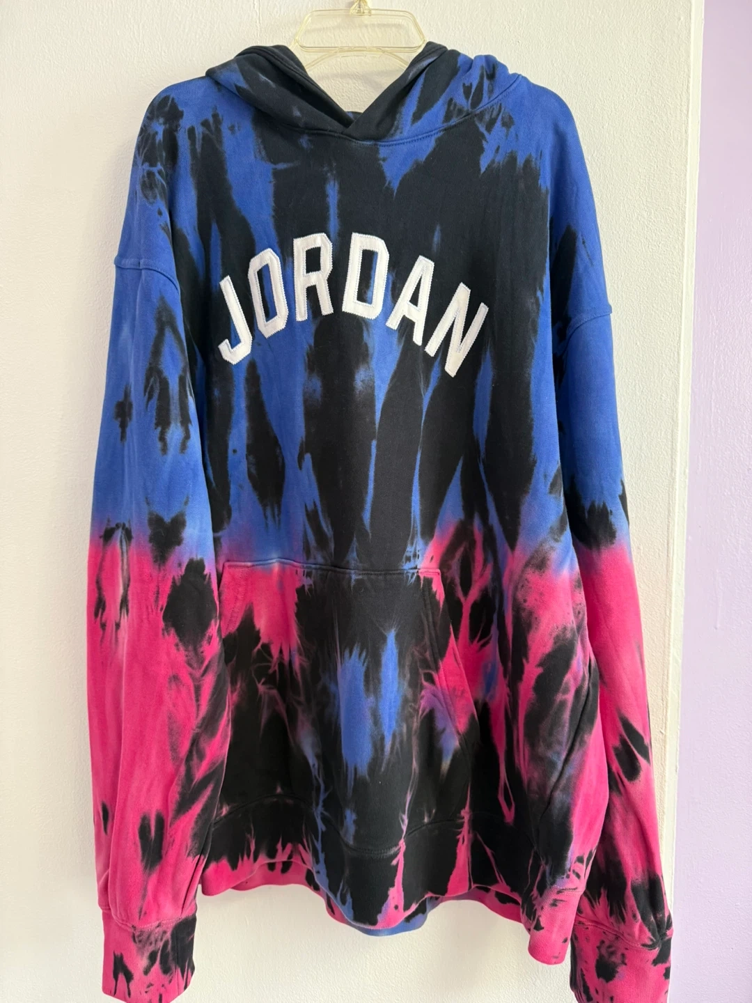 65Selling a Jordan pullover hoodie with a cool tie-dye design! The colors are a mix of blue, black, and pink. It's in great condition and ready for a new home