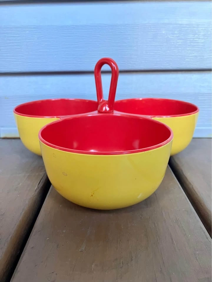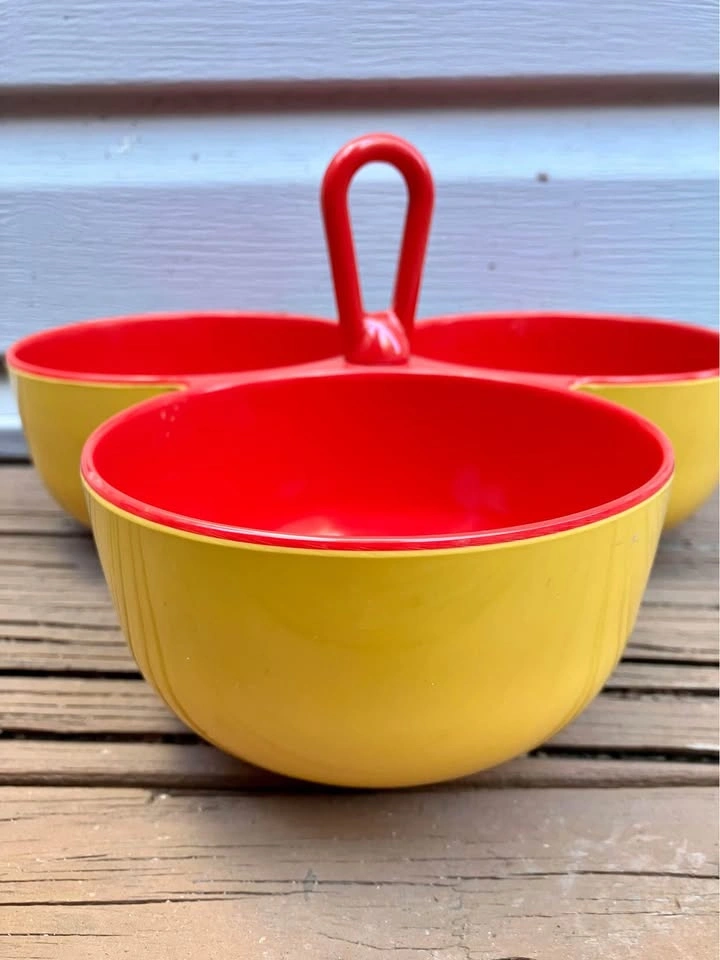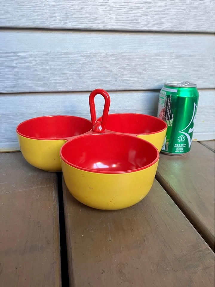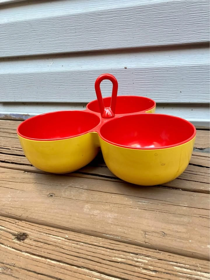 “Summer Fiesta” triple bowl serving tray with handle. Excellent condition with no chips or cracks. Exterior is golden yellow and bowl interiors are tomato red. Individual bowls are 4.5” in diameter and 2.5” deep. Handle is 2.25” tall. Item color scheme adds a festive touch to any gathering. Dishwasher safe top shelf only. Not safe for microwave. From a smoke and pet free home. Check out in person before purchasing. Thanks for looking.