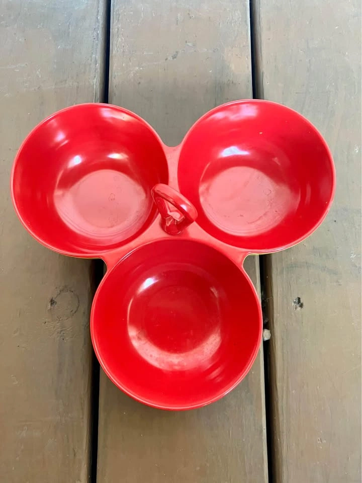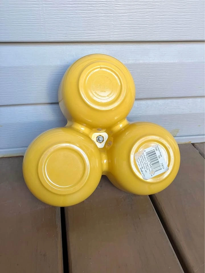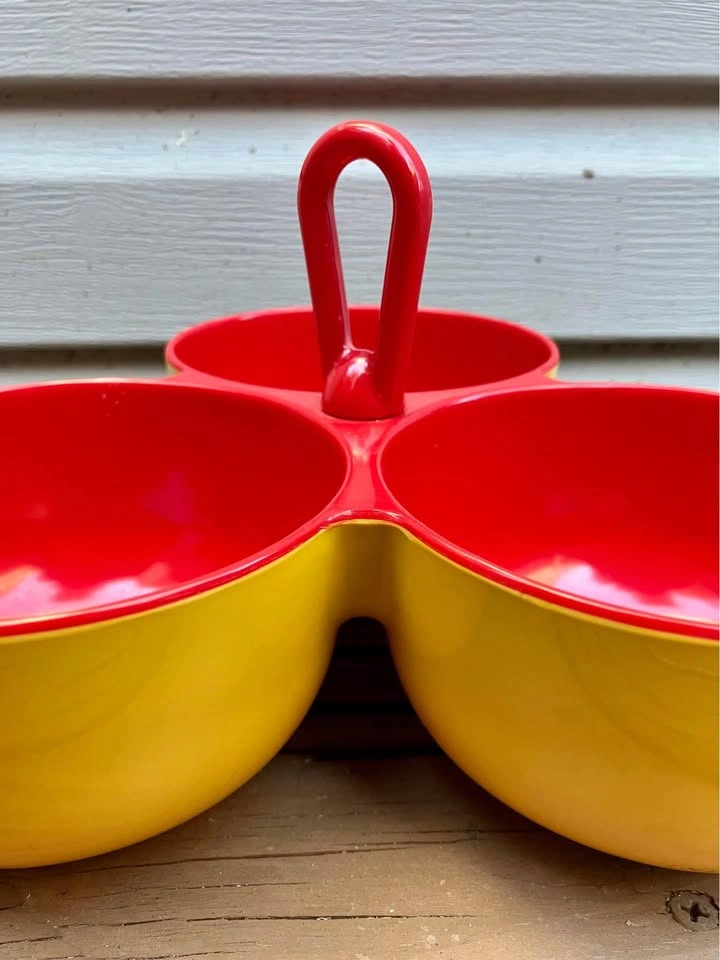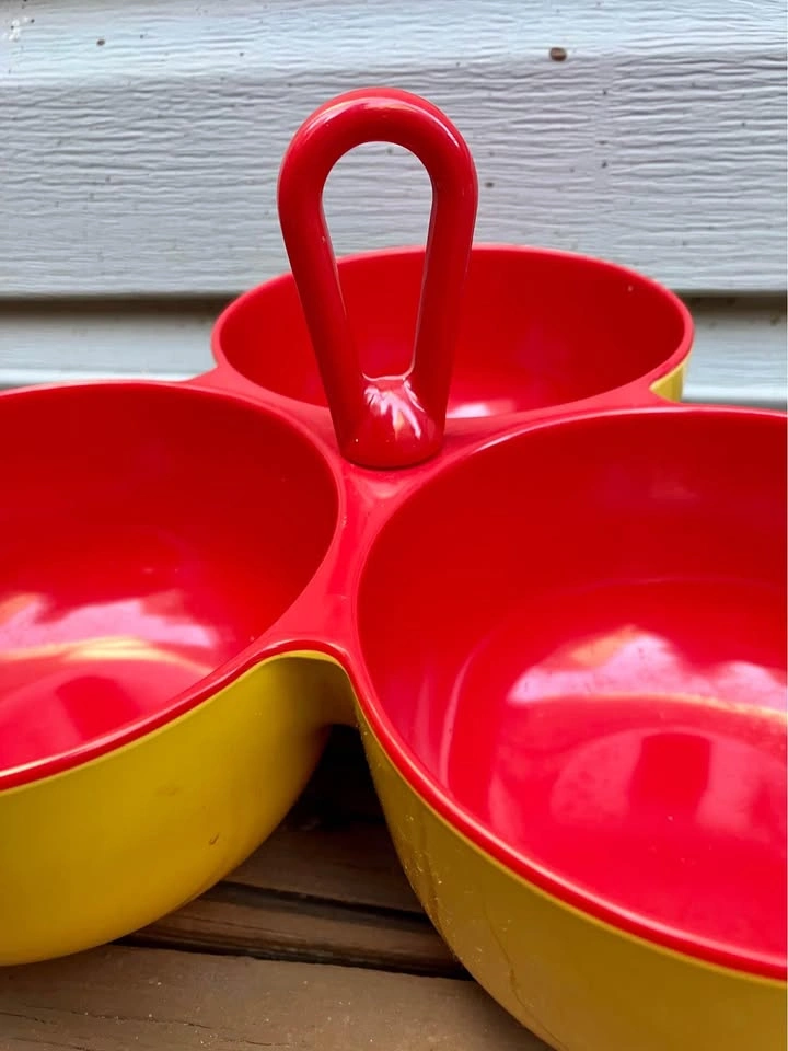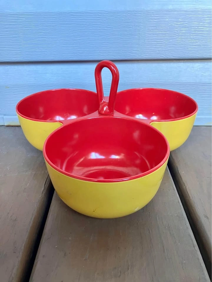 “Summer Fiesta” triple bowl serving tray with handle. Excellent condition with no chips or cracks. Exterior is golden yellow and bowl interiors are tomato red. Individual bowls are 4.5” in diameter and 2.5” deep. Handle is 2.25” tall. Item color scheme adds a festive touch to any gathering. Dishwasher safe top shelf only. Not safe for microwave. From a smoke and pet free home. Check out in person before purchasing. Thanks for looking.