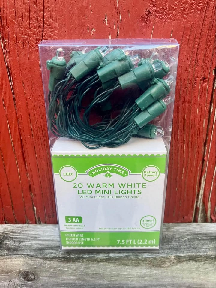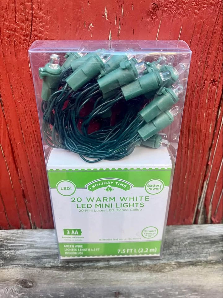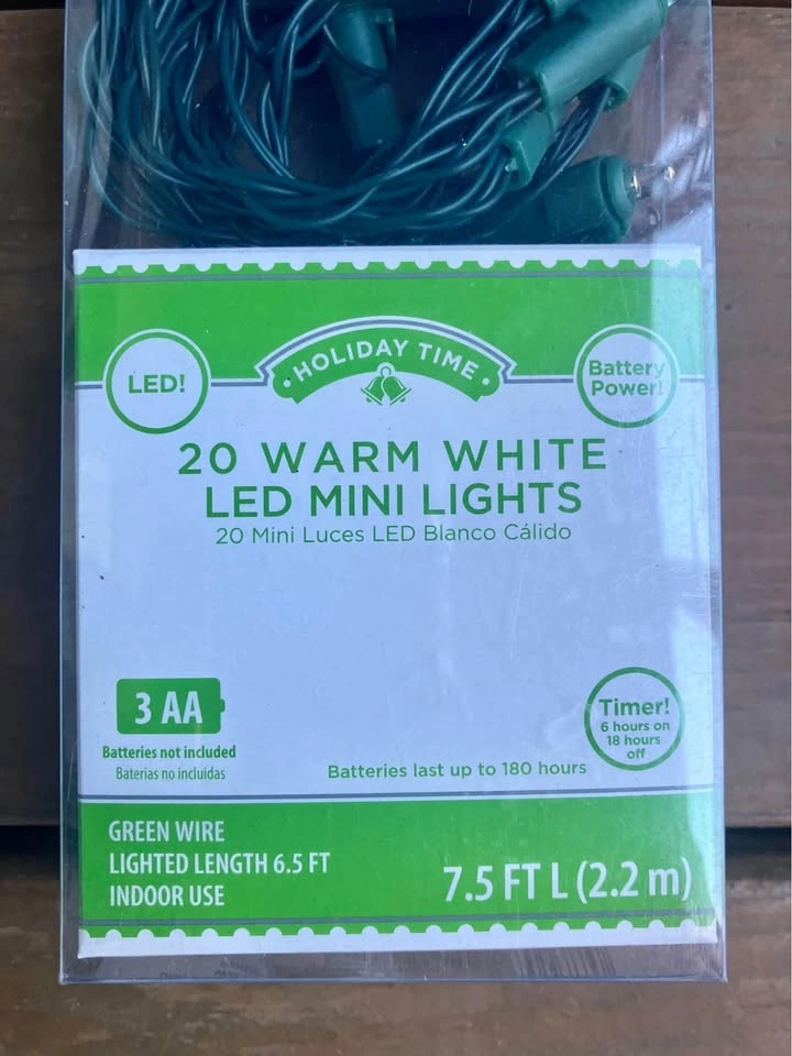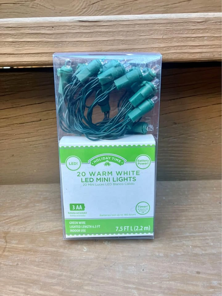 Battery Powered 20 Warm White LED Mini Lights With Timer - Brand New 7.5 foot string of 20 warm white LED mini lights that are powered by 3 AA batteries. Brand new in the original packaging. Batteries not included. On/off timer switch. Timer is 6 hours on and 18 hours off. Batteries last up to 180 hours of actual light time. Green wire blends with branches. Durable bulbs are break, fade and chip resistant. From a smoke and pet free home. Thanks for looking.