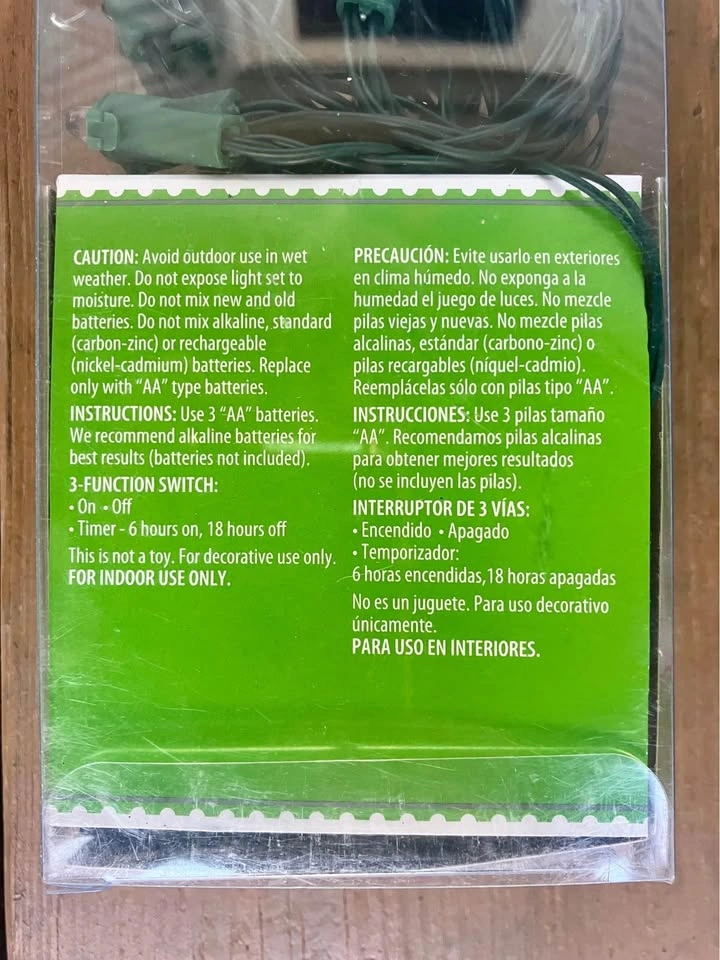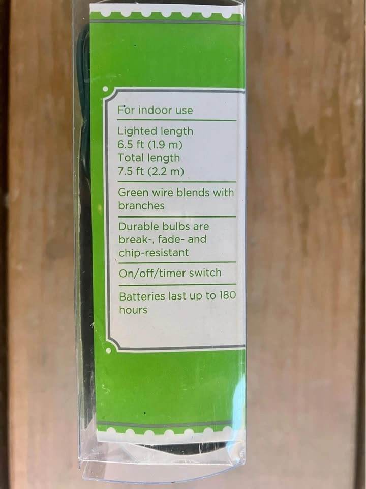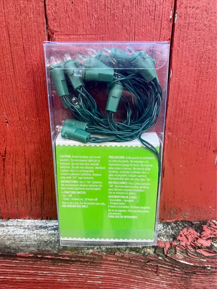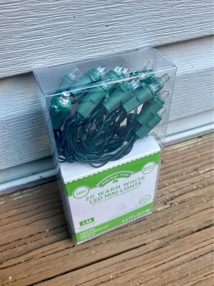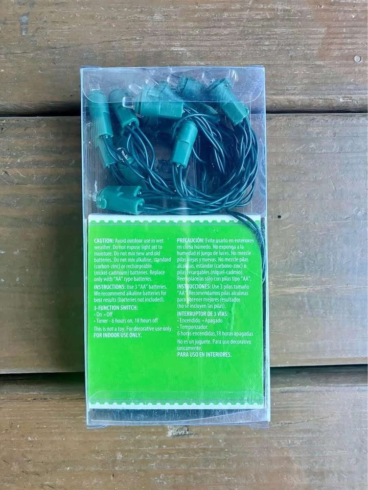 Battery Powered 20 Warm White LED Mini Lights With Timer - Brand New 7.5 foot string of 20 warm white LED mini lights that are powered by 3 AA batteries. Brand new in the original packaging. Batteries not included. On/off timer switch. Timer is 6 hours on and 18 hours off. Batteries last up to 180 hours of actual light time. Green wire blends with branches. Durable bulbs are break, fade and chip resistant. From a smoke and pet free home. Thanks for looking.