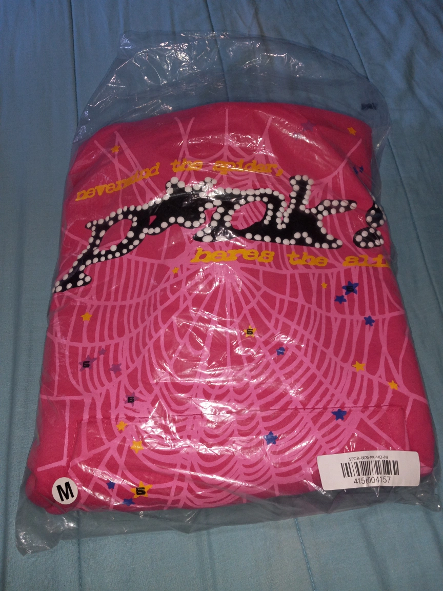 Selling a pink hoodie and sweatpants set with a spider web design! The set is size medium and comes in the original packaging. Perfect for a casual and stylish look!