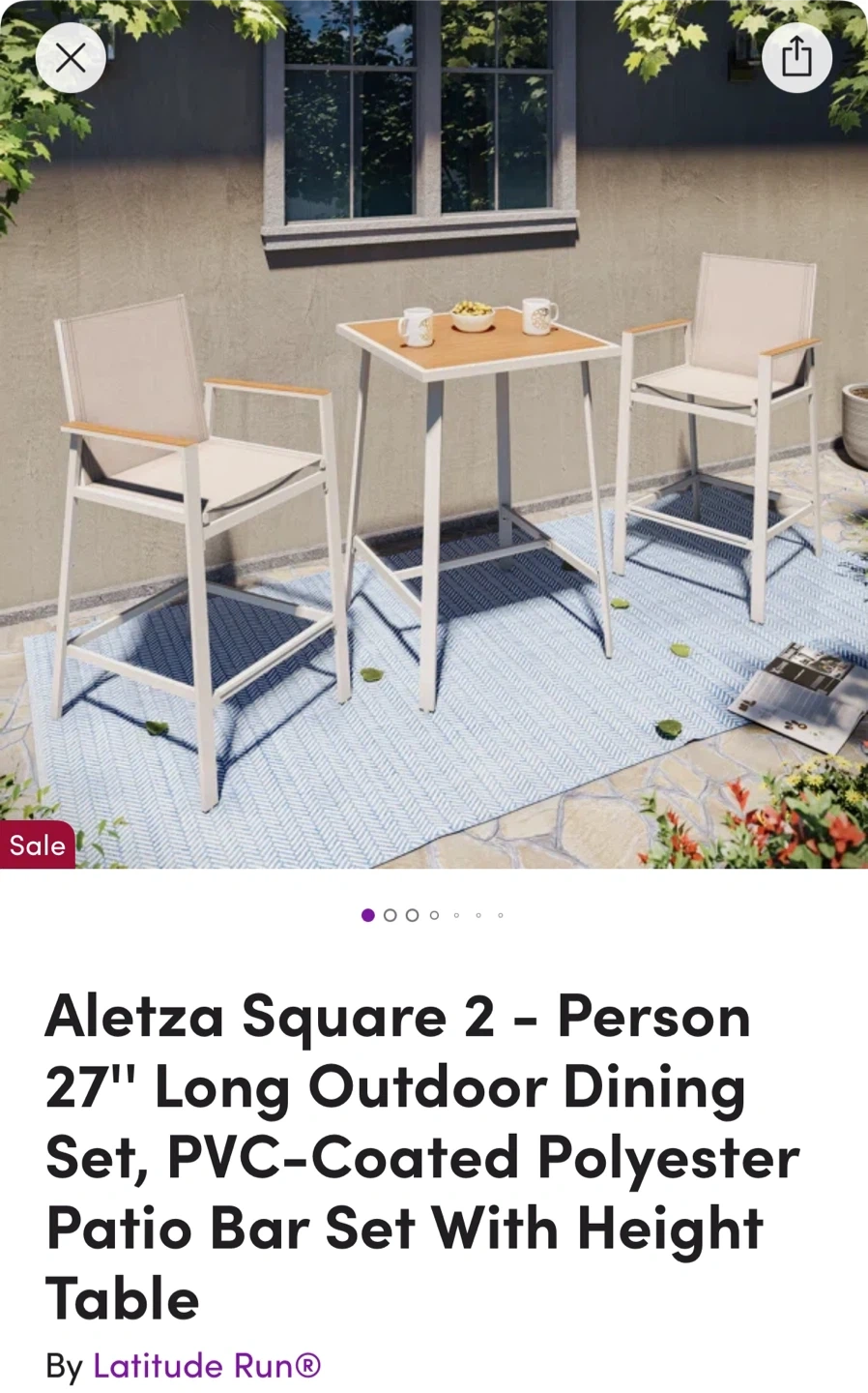 10Selling a brand new still in the box!! Latitude Run Aletza Square 2-Person 27" Long Outdoor Dining Set. It features a PVC-Coated Polyester Patio Bar Set with a Height Table. The set is made with high-quality textilene material that is breathable and weather resistant. The frame is a thickened galvanized pipe frame with a supporting arc design and cross-shaped structure