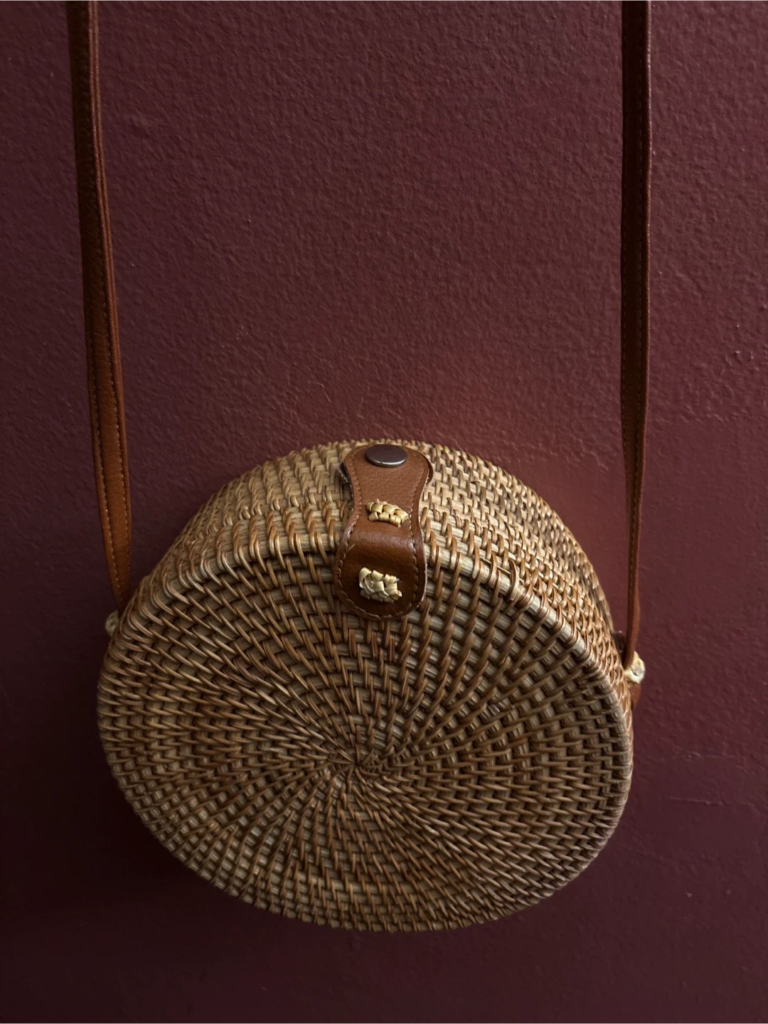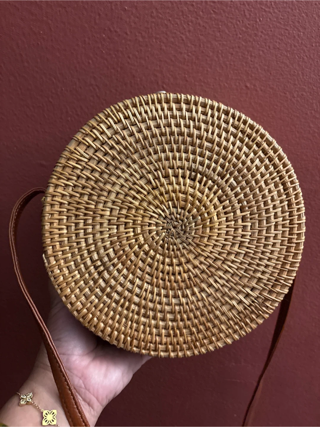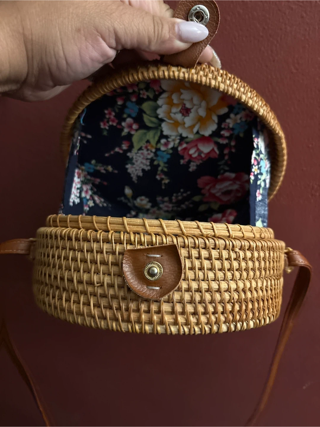 1000+This is a cute woven rattan round crossbody bag! It's a unique accessory that will add a natural and stylish touch to any outfit. The interior is lined with a floral pattern fabric. New
