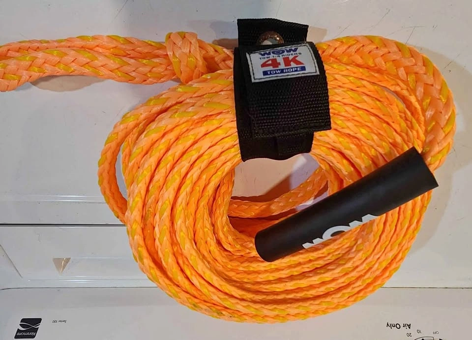 77New without tags 4k tow rope. Boasting an impressive 4125-pound break strength, this WOW Sports tow rope ensures a secure and reliable towing experience, making it suitable for towing 1 to 4 riders simultaneously. With a generous 60-foot length, this tow rope provides ample distance between the boat and towables, offering a comfortable towing distance for an enjoyable ride. Engineered with a robust 16-strand construction, this tow rope by WOW Sports ensures durability and resilience, handling the rigors of towing inflatables with ease. Equipped with a floating foam handle, the tow rope remains visible and easily retrievable in the water. This feature adds an extra layer of ease and convenience, ensuring hassle-free use and storage. $25 MSRP