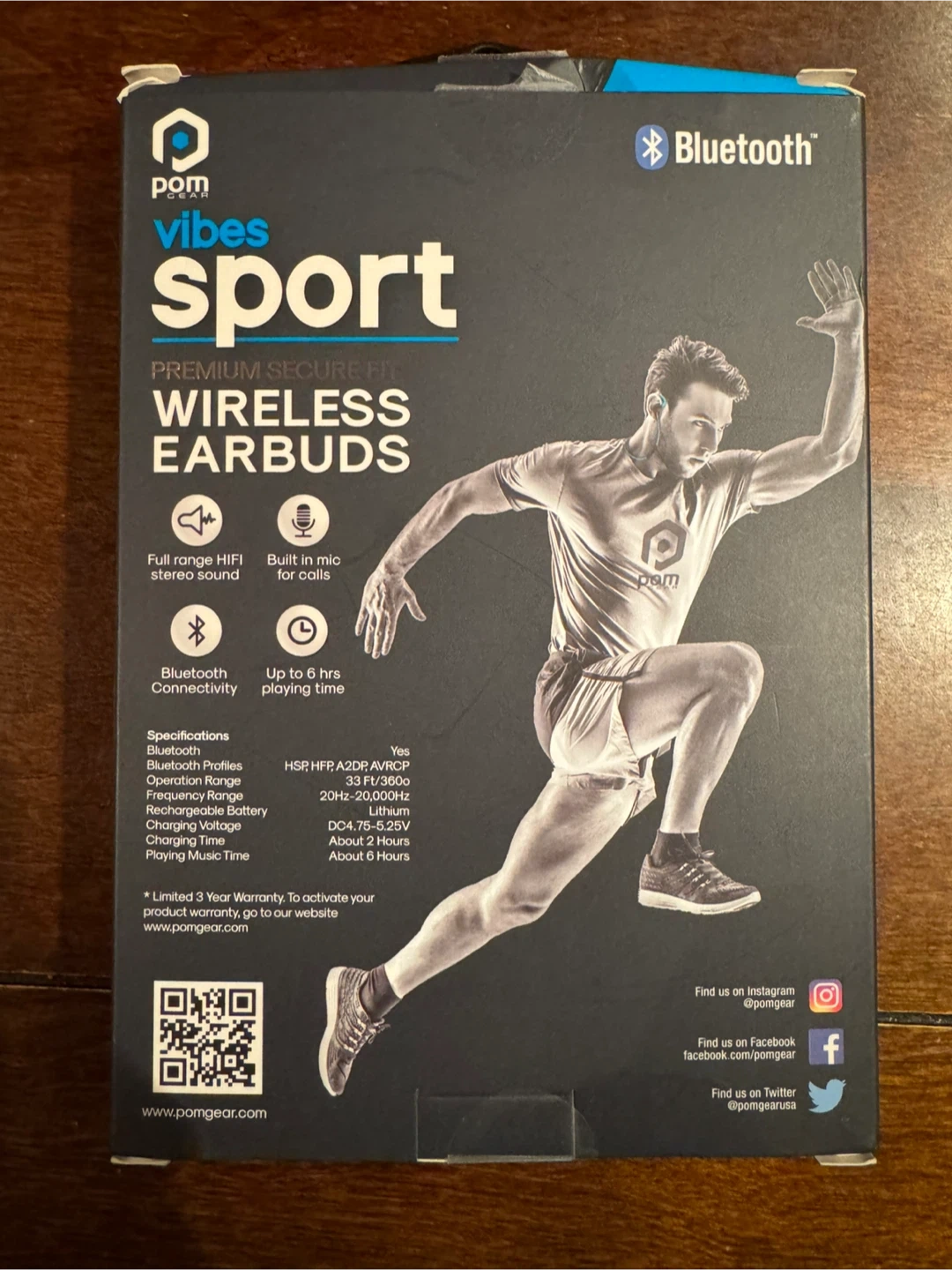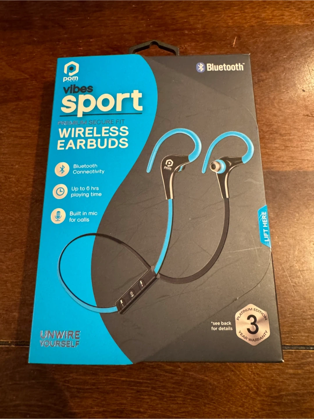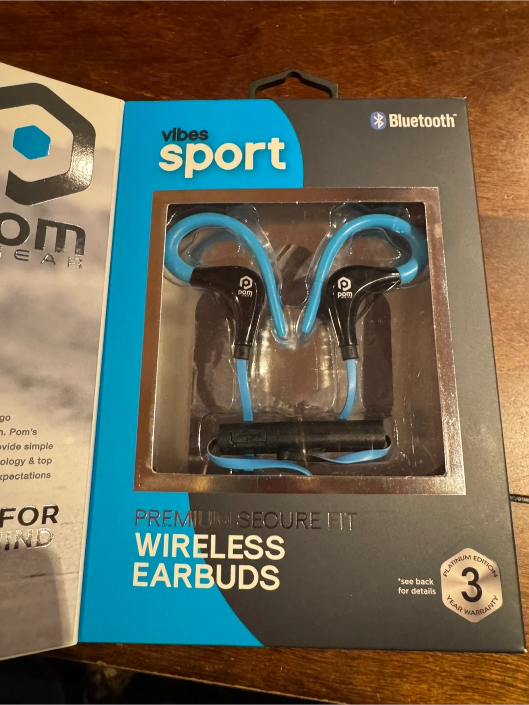 60Selling a brand new pair of Pom Gear Vibes Sport Wireless Earbuds! These are the Platinum Edition and come in the original box. They feature Bluetooth connectivity, a built-in mic for calls, and up to 6 hours of playing time. Get ready to un-wire yourself! Comes in original box.