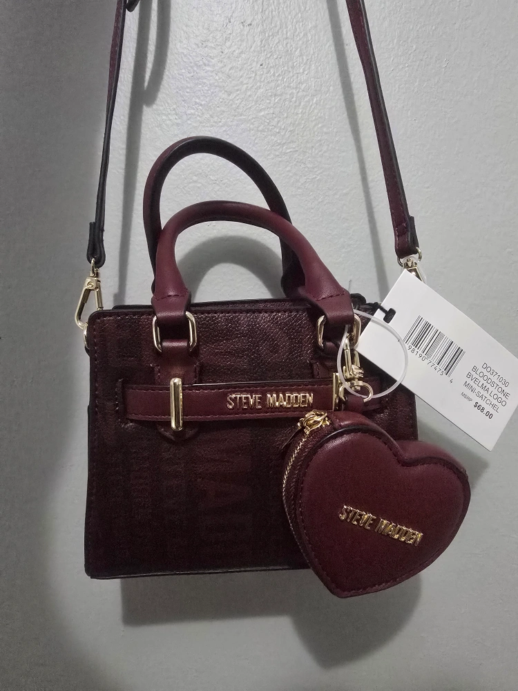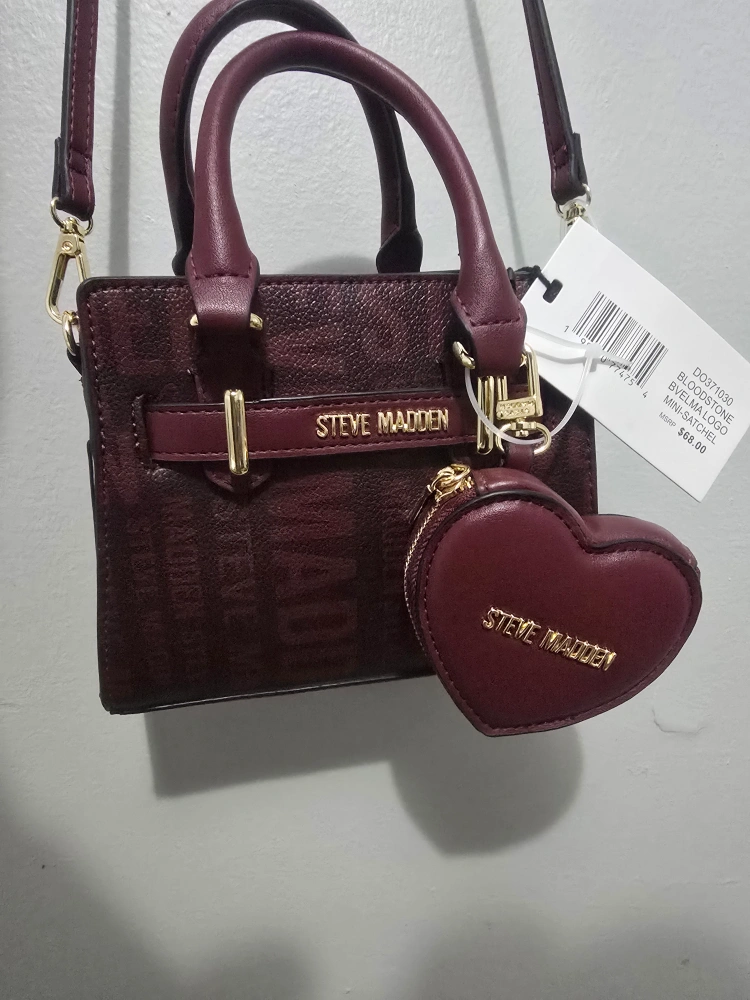 This is a Steve Madden Bloodstone Evelina Logo Mini Satchel. It's a really cute purse with a heart-shaped charm. The original price was $68.00